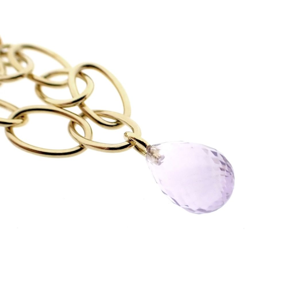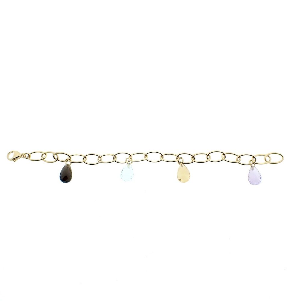 Gold anchor link bracelet with four briolette-cut gemstones. The stones consist of amethyst, aquamarine, citrine, and smoky quartz and are light purple, light blue, honey yellow, and gray/brown. A unique and colorful combination of gemstones. The bracelet closes with a lobster clasp and is crafted from 14-karat yellow gold (585/1000).