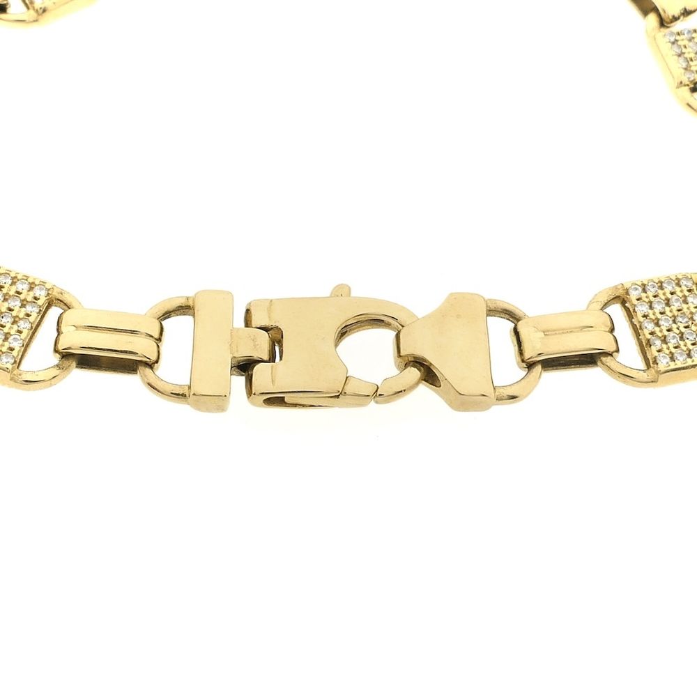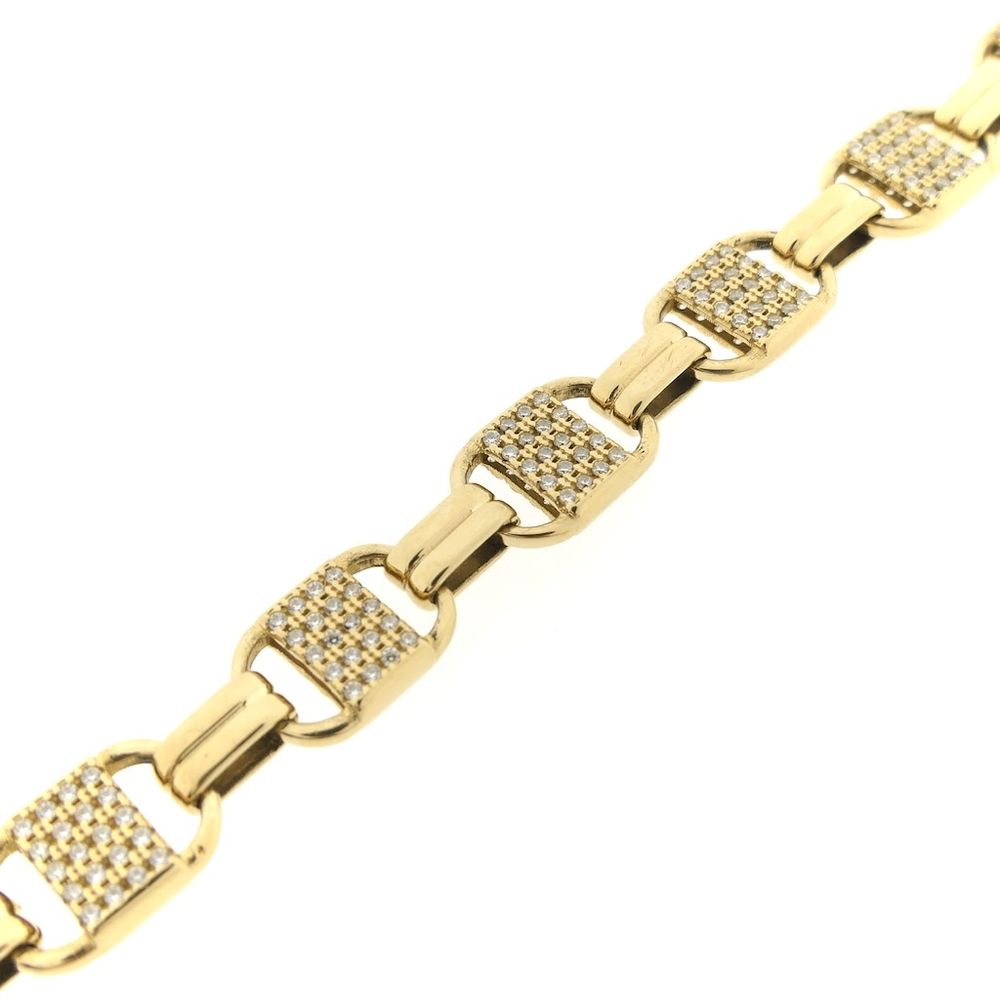 Gold bracelet with decorative links. The links are interspersed with ten gold rectangular panels pavé-set with zirconia stones. This bracelet has a robust appearance and is a real eye-catcher! It features a solid lobster clasp and is crafted from 14-karat yellow gold (585/1000). Weighing 30.96 grams, it's an exclusive piece of jewelry.