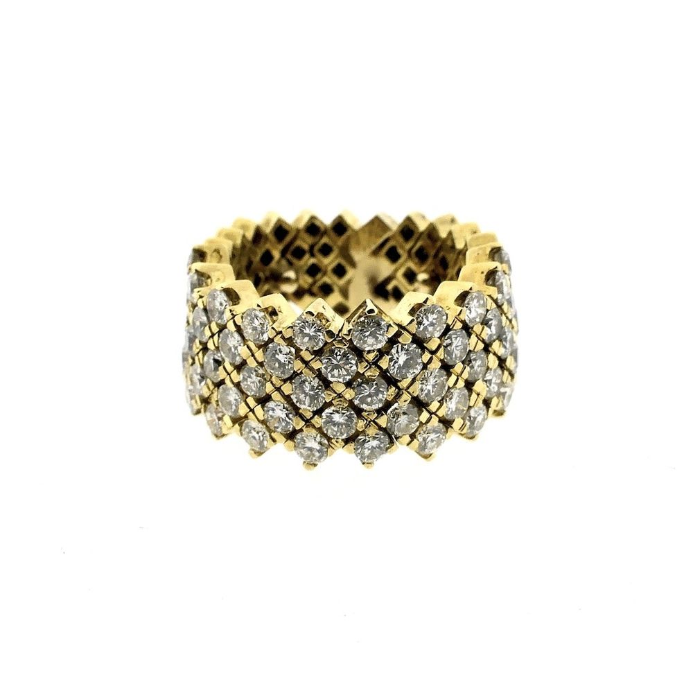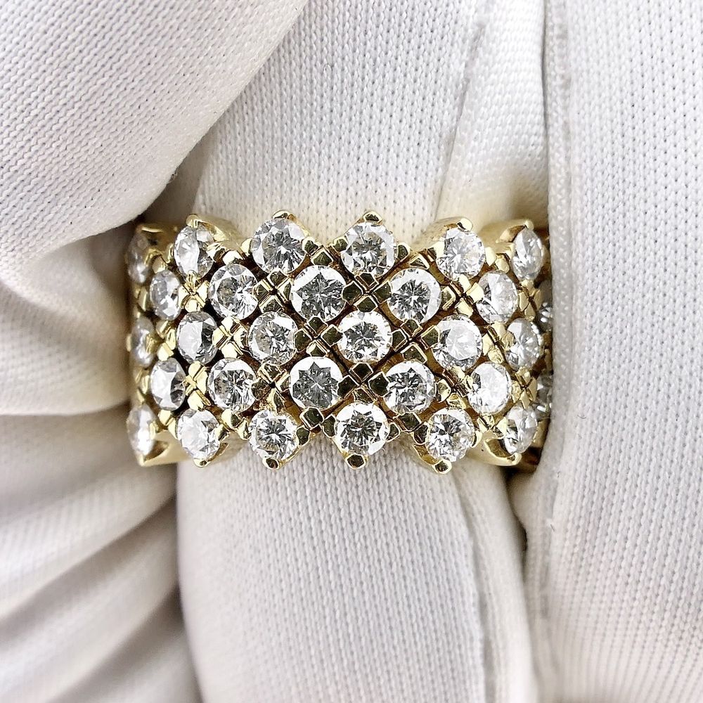 Gold ring, pavé-set with a total of 2.50 ct. natural diamonds. The ring is made of links, making it somewhat flexible. Two small balls are placed on the inside to prevent rotation. The ring is crafted from 18-karat yellow gold (750/1000).
