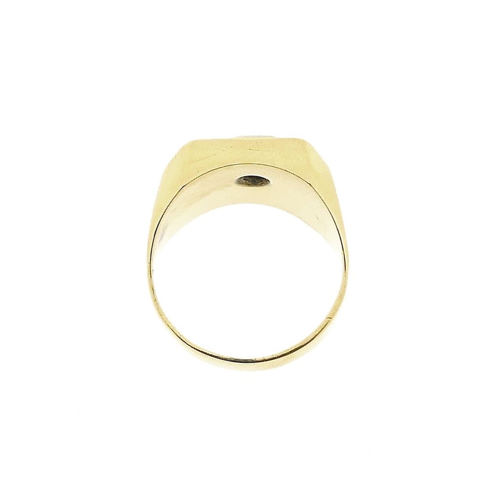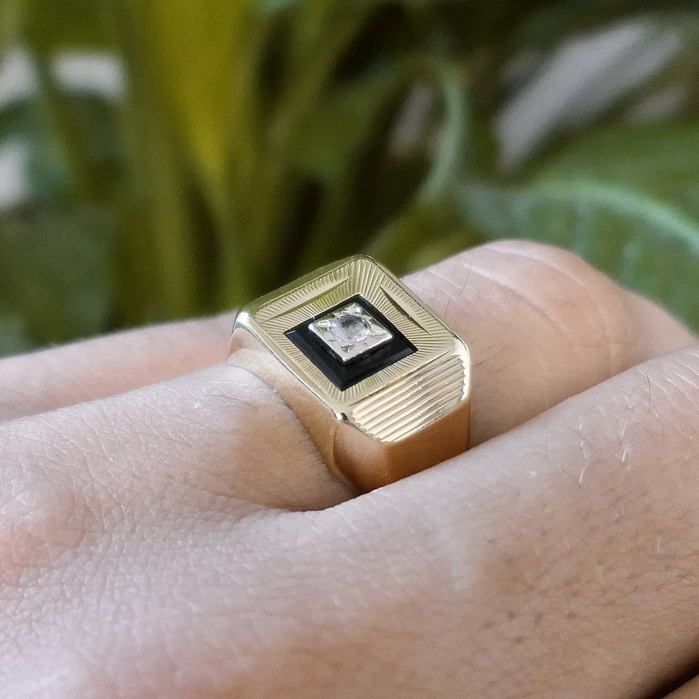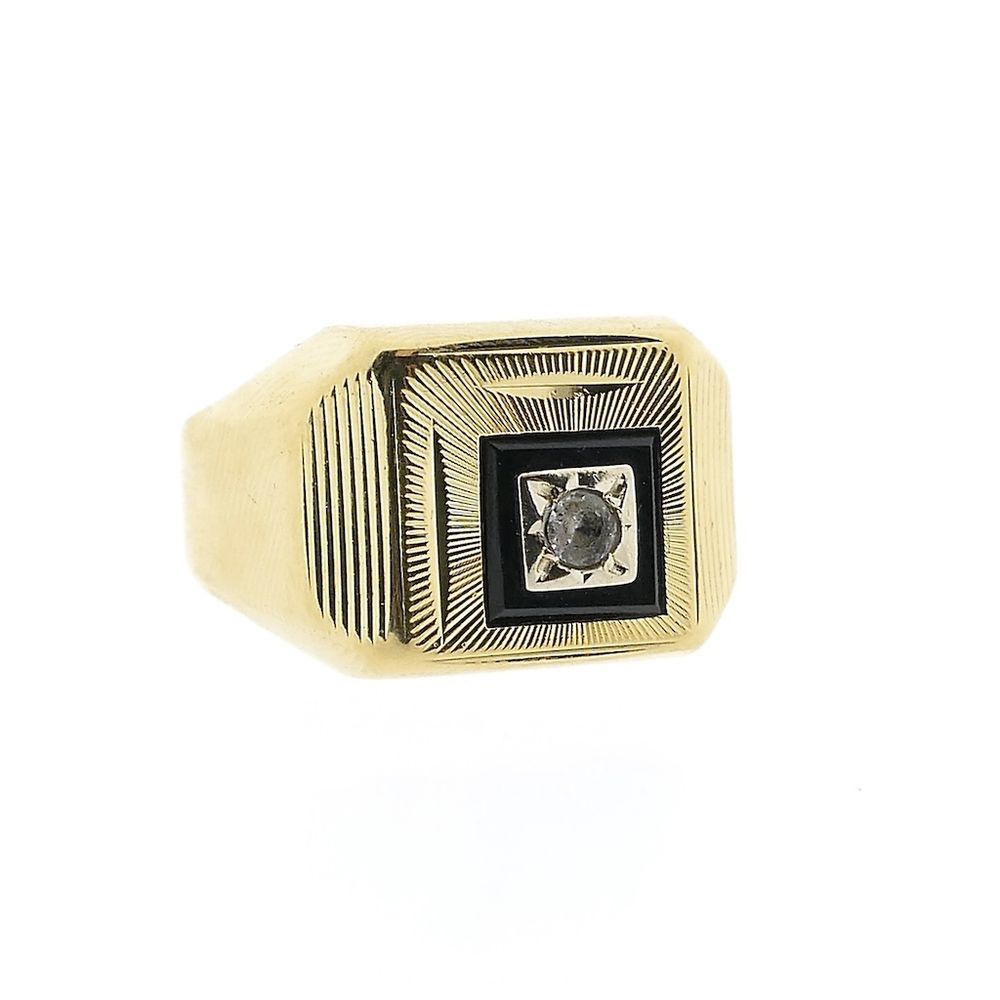 Gold signet ring set with onyx and a round, brilliant-cut zirconia stone in the center. The jet-black stone is square, and the zirconia is set in white gold. The ring is detailed and smoothly finished. The ring head and both sides of the head are patterned. This beautiful men's ring is crafted from 14-karat yellow gold (585/1000).