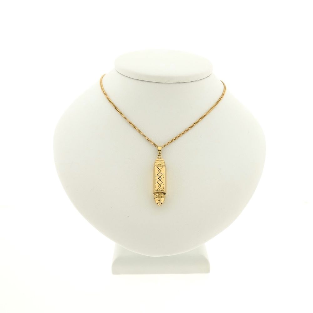 Gold mezuzah pendant. A mezuzah, a small container containing a sacred text, hangs on the right doorpost of many Jewish homes. Upon entering, worshippers touch it briefly and then bring their fingers to their lips. The pendant is made of 14-karat yellow gold (585/1000).