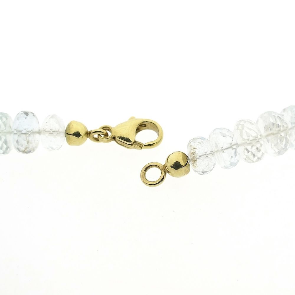 Morganite bead necklace with gold links and a gold clasp. The beads are strung on an elastic cord. The necklace closes with a lobster clasp crafted from 14-karat yellow gold (585/1000).