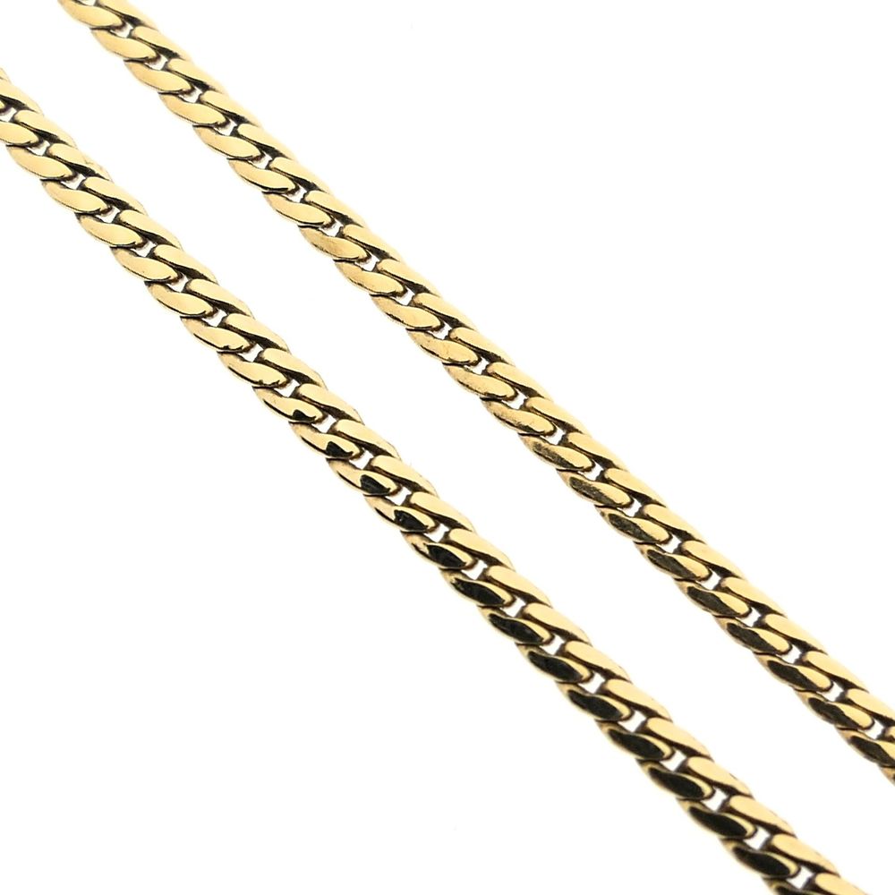A flat gold gourmet link necklace with a fixed pendant, set with sapphires and a 0.02 ct. diamond. The chain link is 2.0 mm wide. The necklace is crafted from 14-karat yellow gold (585/1000).
