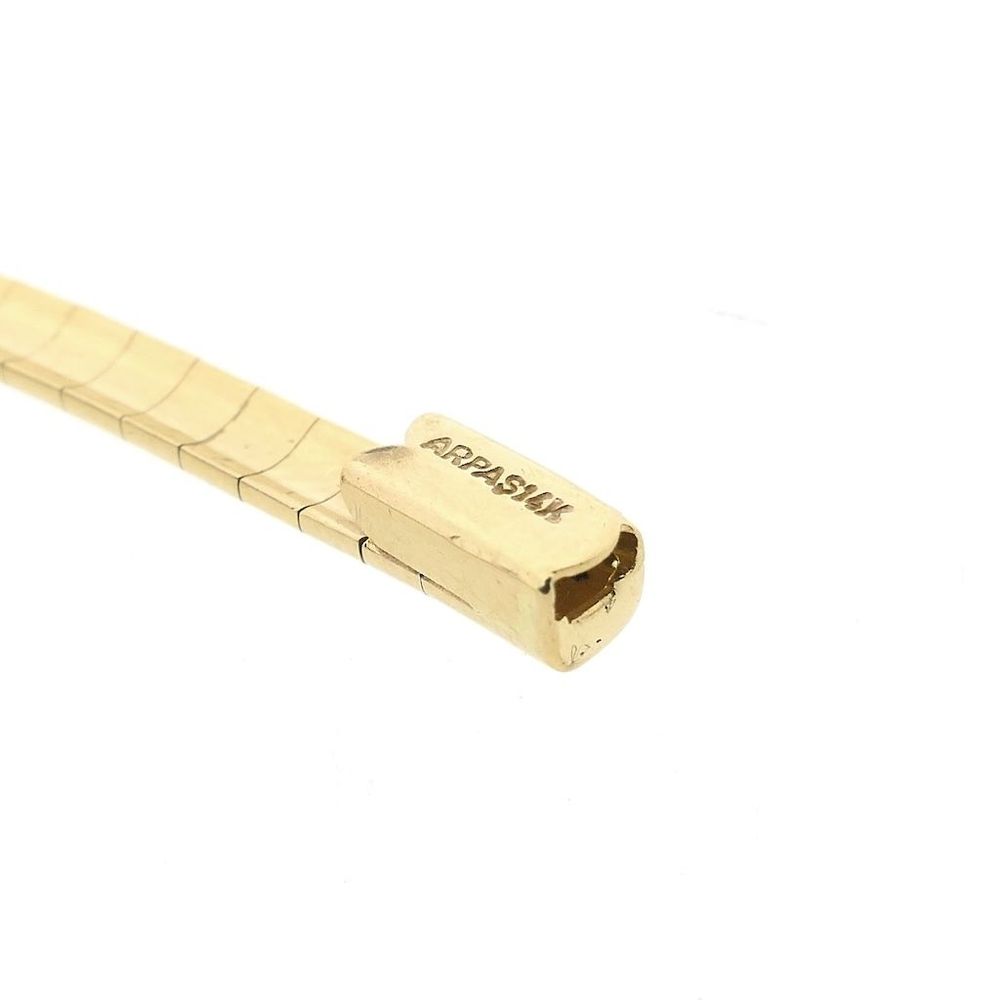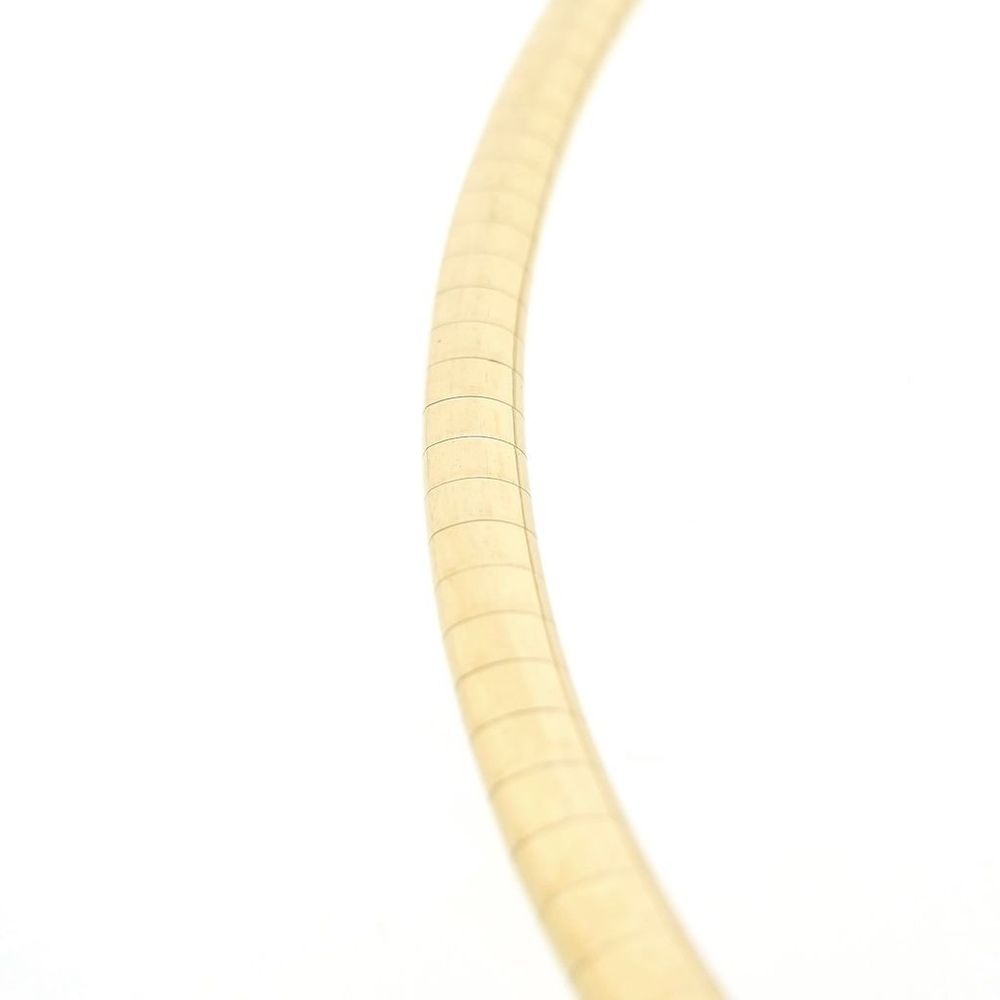 Gold necklace with smooth omega links in a V-shape. The omega links are closely spaced, creating a beautifully striking ensemble. The necklace has an elegant and luxurious appearance and closes with a box clasp with a safety hook. Crafted from 14-karat yellow gold (585/1000), it is a true gemstone.