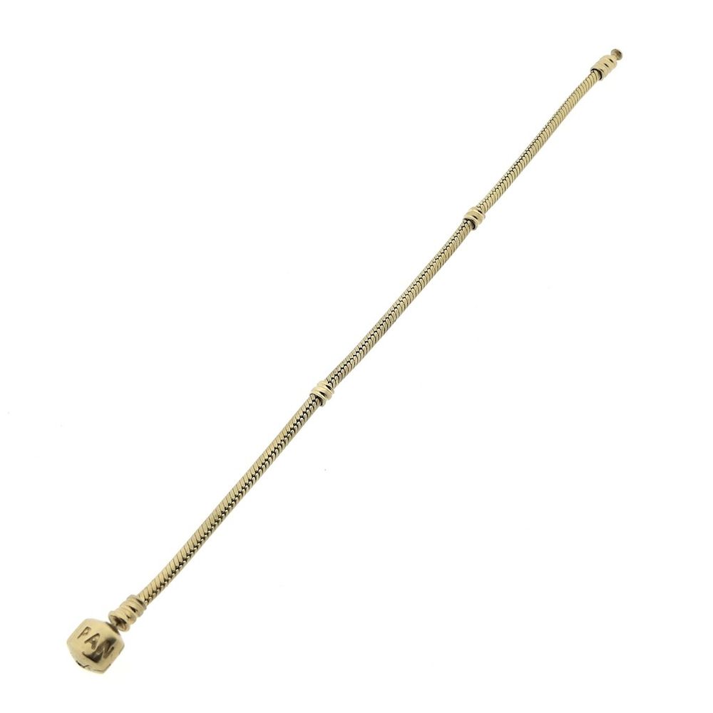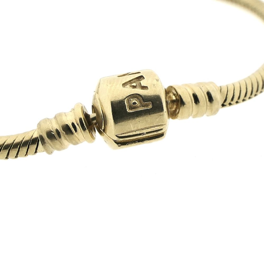 Gold Pandora Moments Snake Chain bracelet. This bracelet is suitable for original Pandora screw charms, clip stoppers, or spacers. The inside of the clasp is hallmarked ALE and 585. The bracelet is made of 14-karat yellow gold (585/1000).