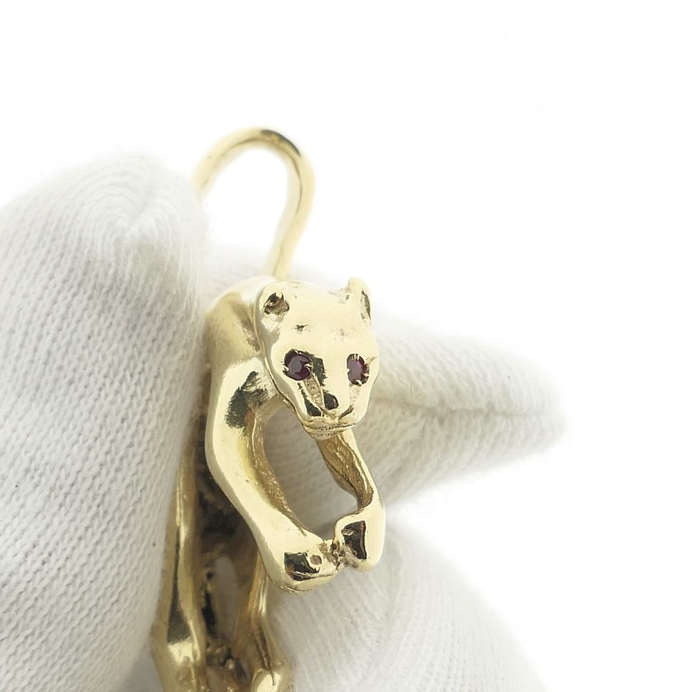 Gold panther pendant. The eyes are set with round brilliant-cut rubies. The pendant is crafted with great detail. A unique and luxurious piece for a necklace. The pendant is made of 14-karat yellow gold (585/1000).