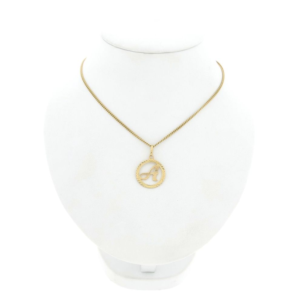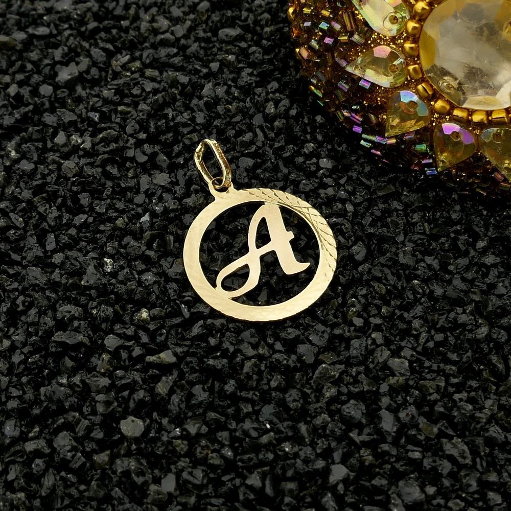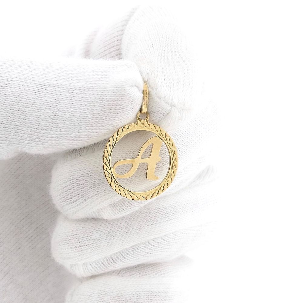 Gold pendant with the letter A. The letter A is set in a round, ribbed frame. The reverse side is completely smooth. The pendant is crafted from 14-karat yellow gold (585/1000).