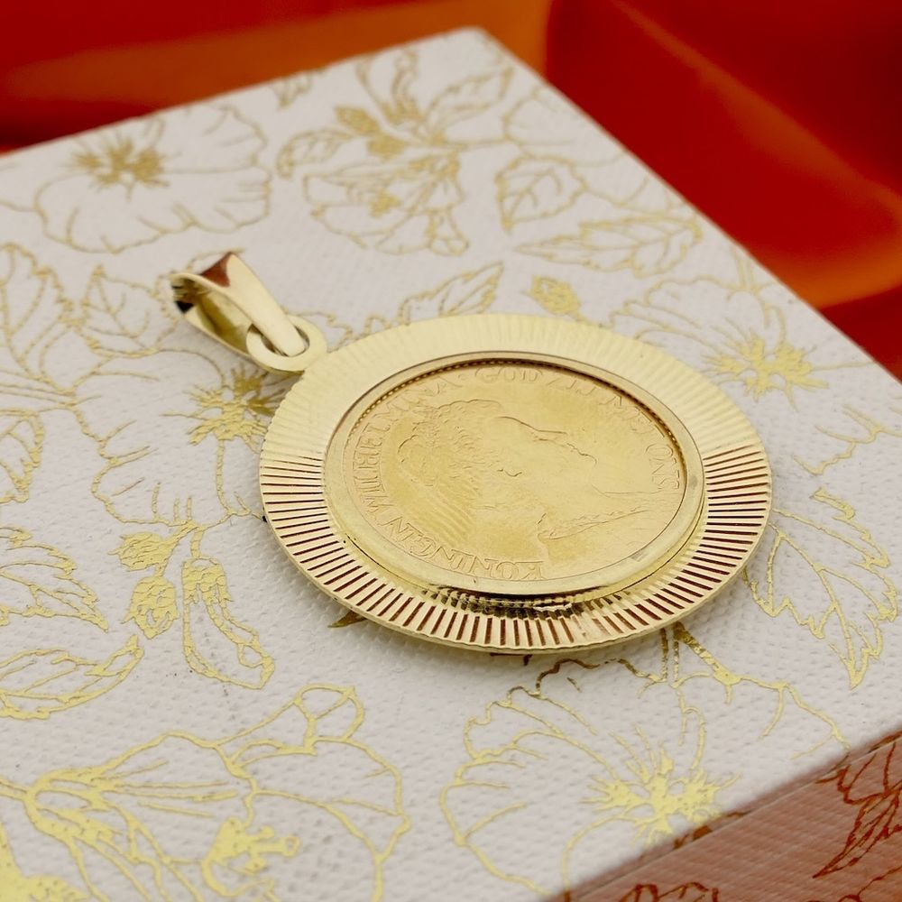 Gold pendant made with a 10-guilder Queen Wilhelmina coin from 1912. The coin is in excellent condition and has an elegant, detailed bezel. The obverse side of the coin features the inscriptions "God zij met ons" (God be with us) and "Koningin Wilhelmina" (Queen Wilhelmina) with a portrait of Queen Wilhelmina. The reverse side of the coin features the inscriptions "Koninkrijk der Nederlanden" (Kingdom of the Netherlands), "10 G," the year the coin was minted, and the Dutch coat of arms. The bezel of the coin is made of 14-karat gold (585/1000), and the coin itself is made of 21.6-karat gold (900/1000).