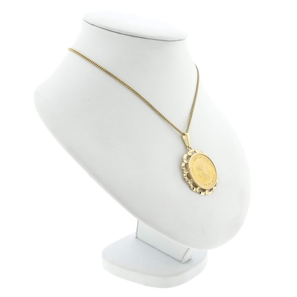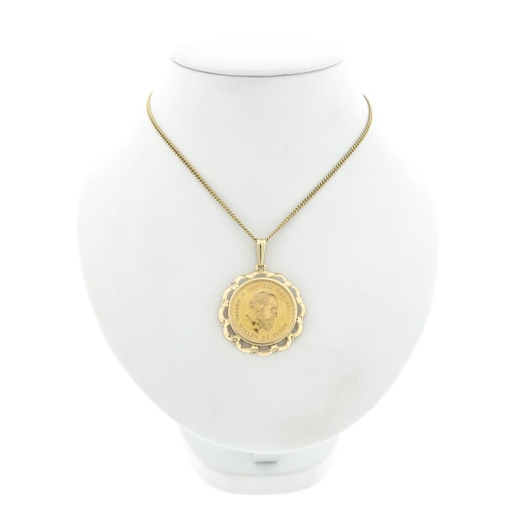 Gold pendant made with a 10-guilder coin of King William III from 1875. The coin is in excellent condition and has an elegant, detailed frame. The obverse side of the coin features the inscriptions "God zij met ons" (God be with us) and "King William III" (King William III) with a portrait of King William III. The reverse side of the coin features the inscriptions "Koninkrijk der Nederlanden" (Kingdom of the Netherlands), "10 G," the year the coin was minted, and the Dutch coat of arms. The frame of the coin is made of 14-karat gold (585/1000), and the coin itself is made of 21.6-karat gold (900/1000).