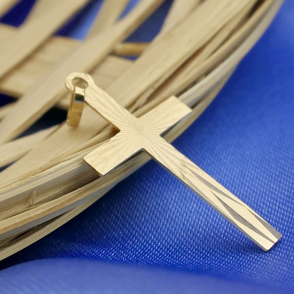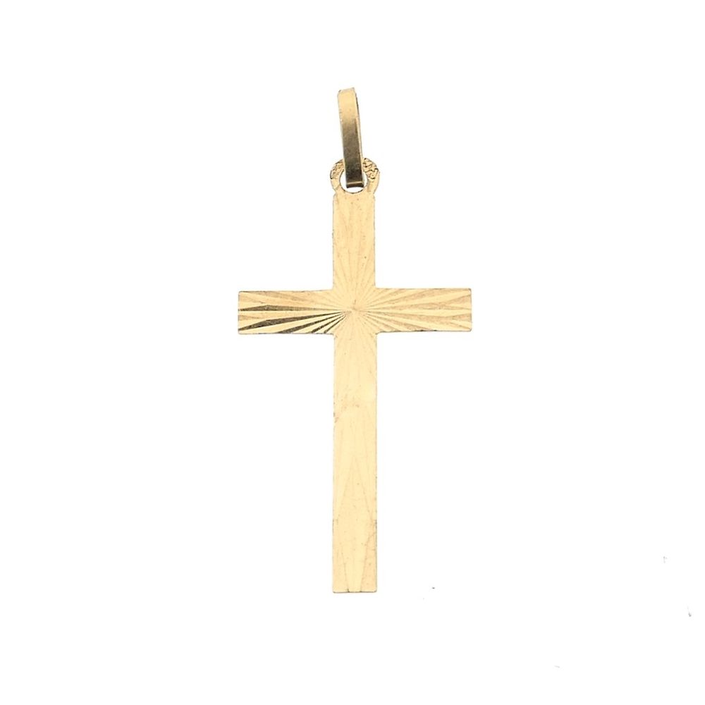 Gold pendant of a cross. The cross is decorated, creating a 3D effect. A subtle and religious piece of jewelry crafted from 14-karat yellow gold (585/1000).