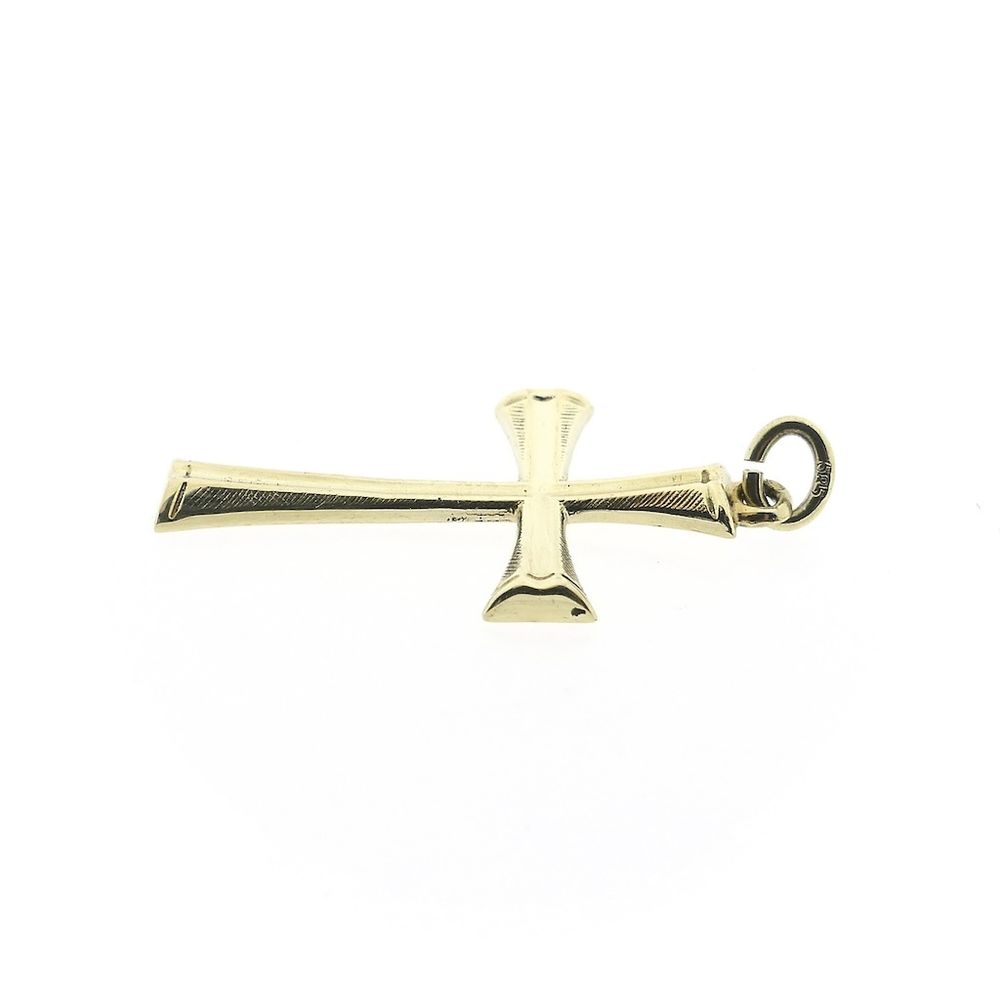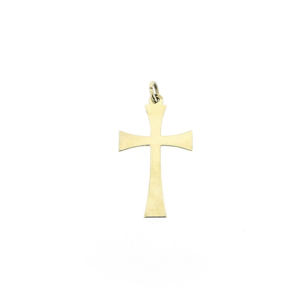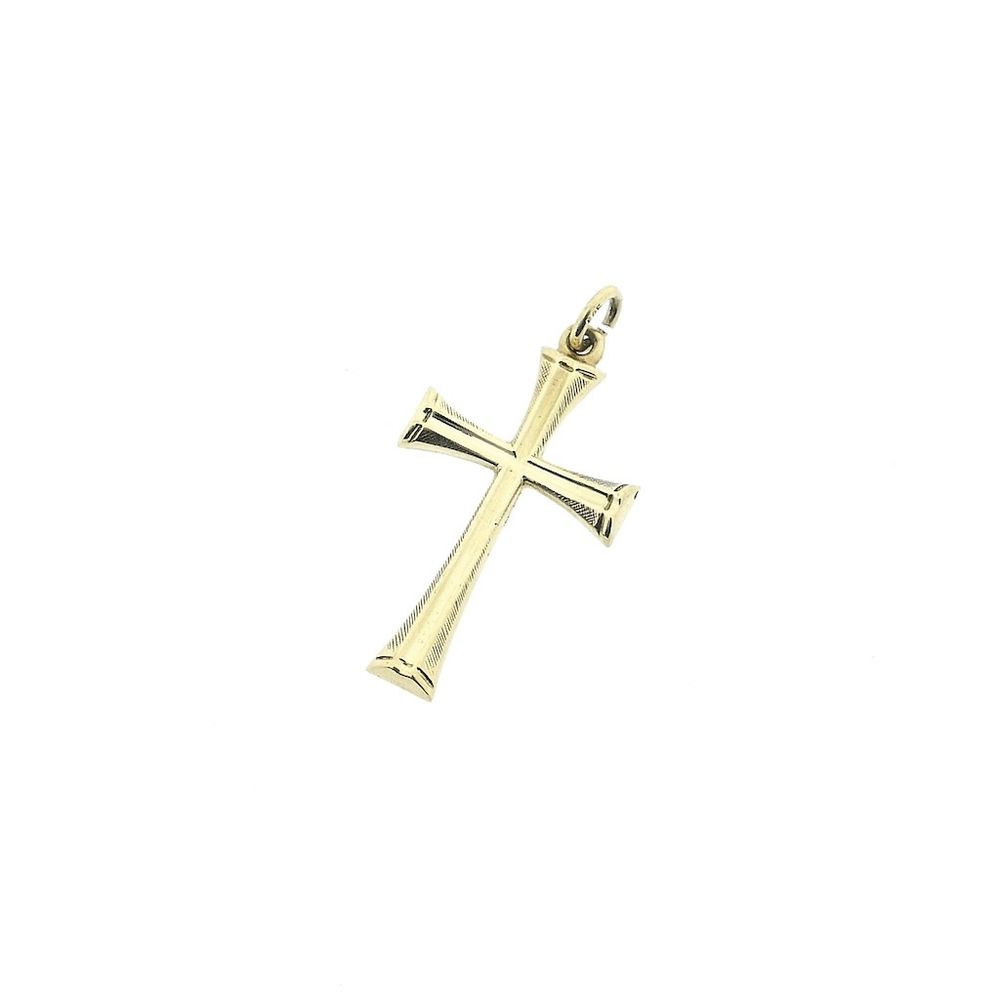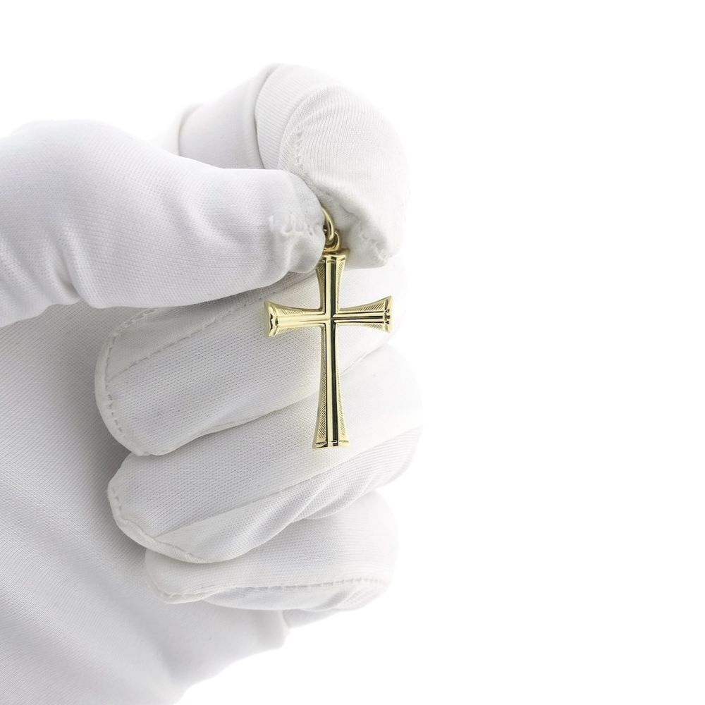 Gold cross pendant for a thin chain. The cross has a smooth finish and is detailed with various engravings. A beautiful and subtle piece of jewelry crafted from 14-karat yellow gold (585/1000).
