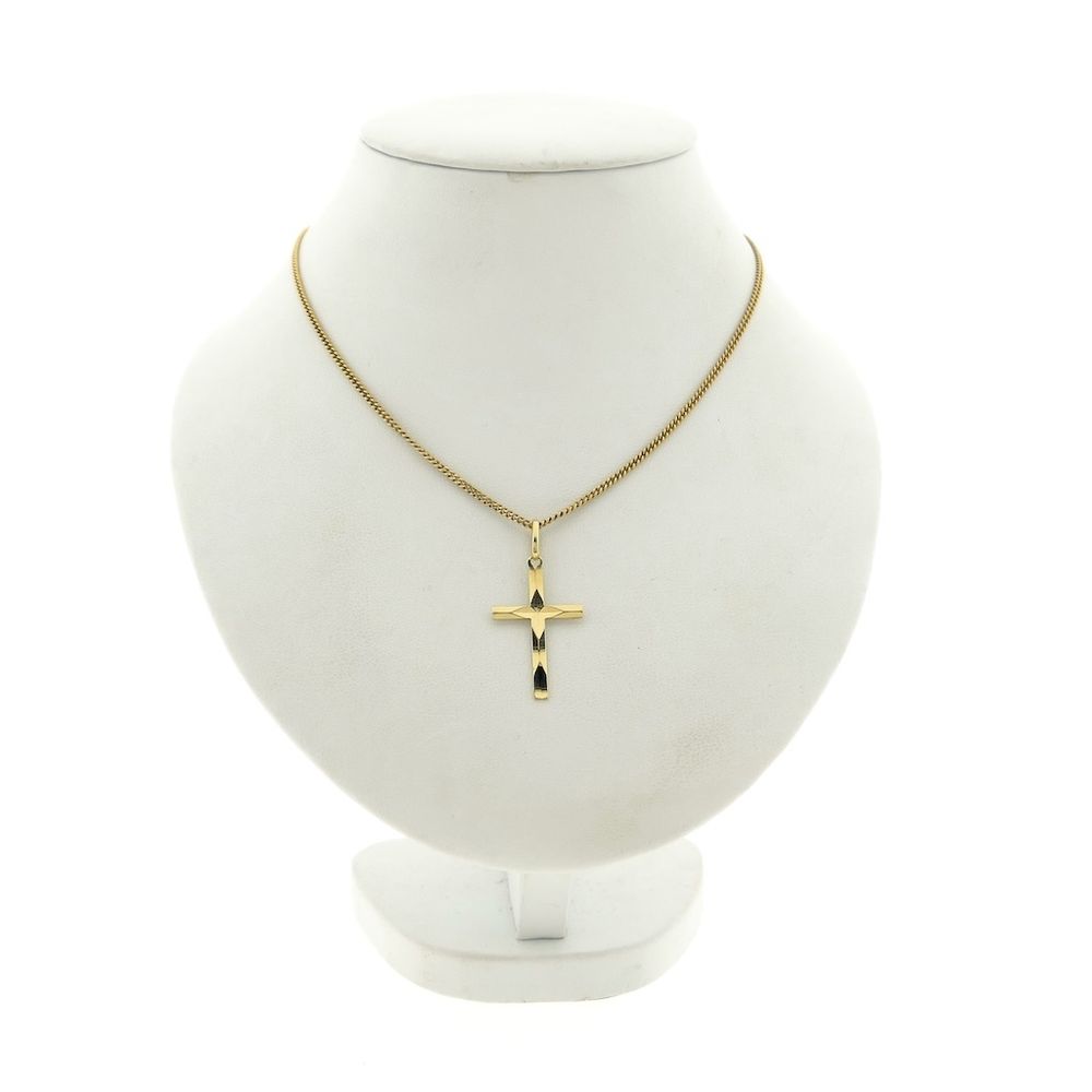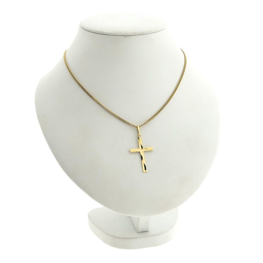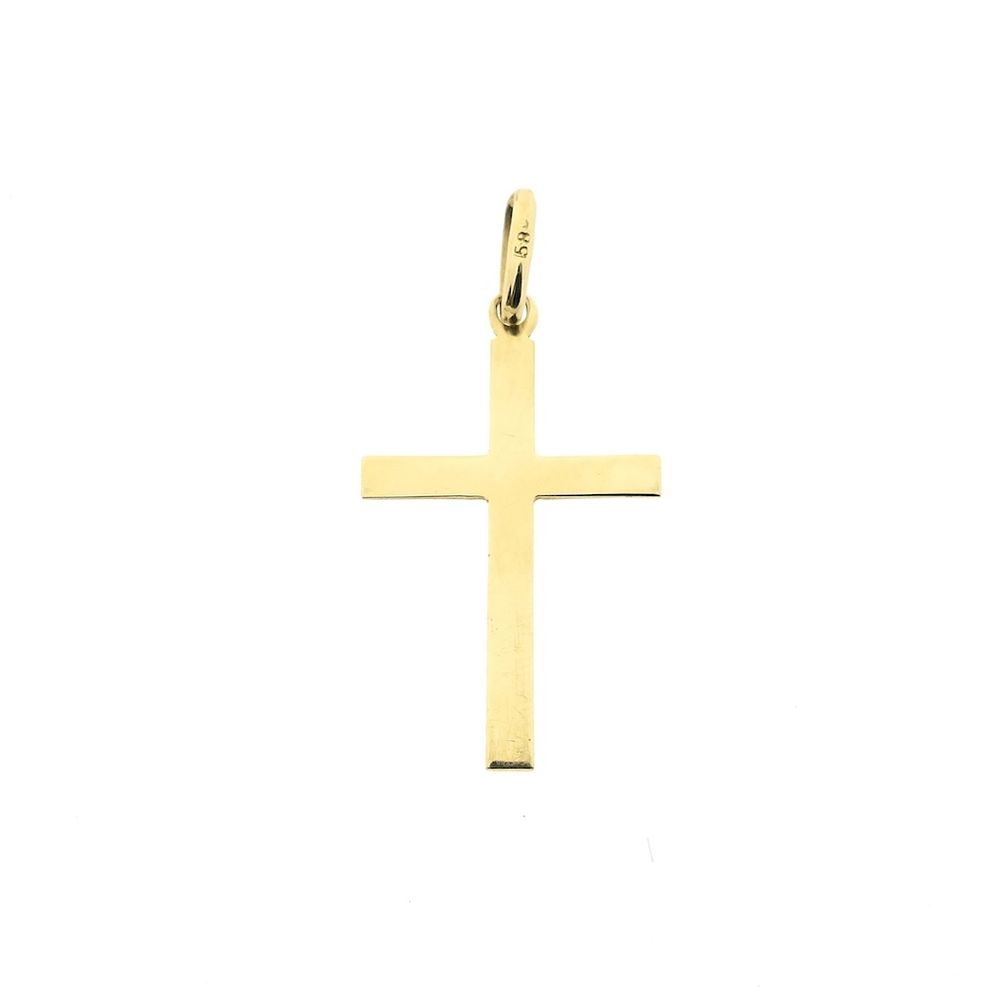 Gold pendant of a cross. The cross is decorated, creating a 3D effect. A subtle and religious piece of jewelry crafted from 14-karat yellow gold (585/1000).