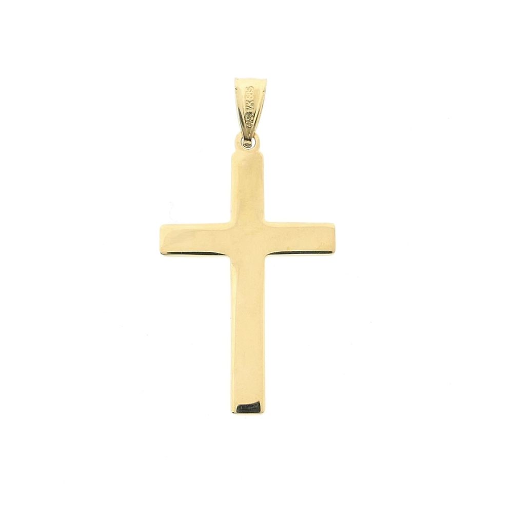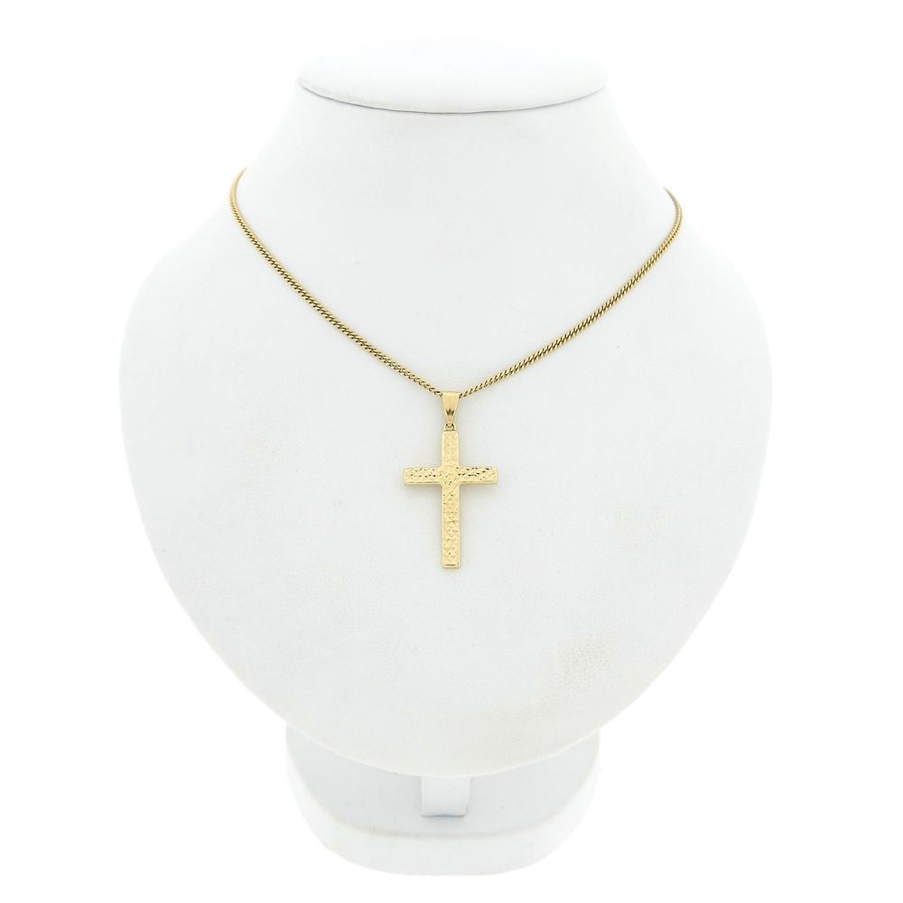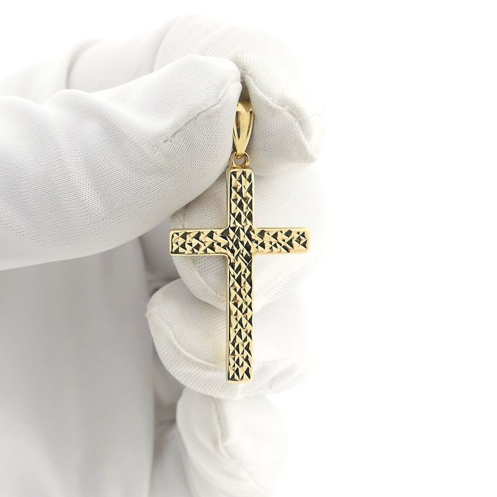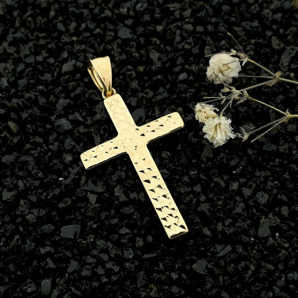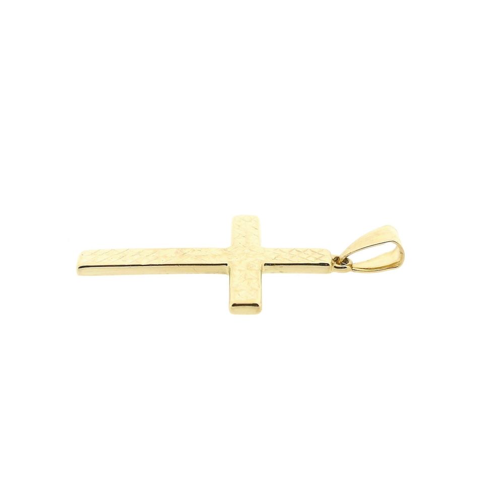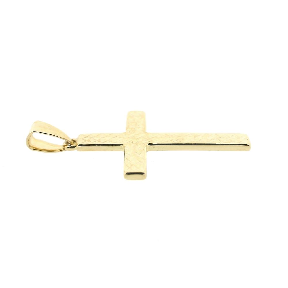 Gold cross pendant. The front of the pendant has a mosaic effect, and the back is fully polished. The pendant is crafted from 14-karat yellow gold (585/1000).