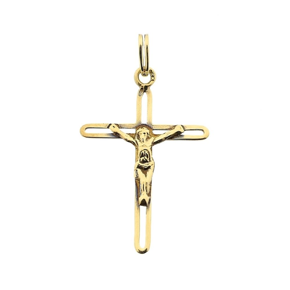 Gold pendant depicting the cross of Christ with its corpus. The cross is openwork, creating a beautiful effect. The pendant is crafted from 14-karat yellow gold (585/1000).