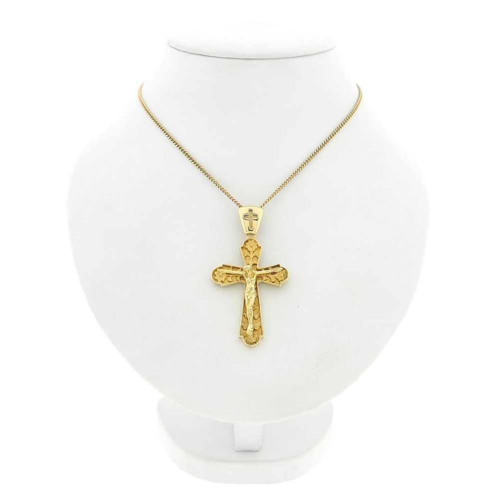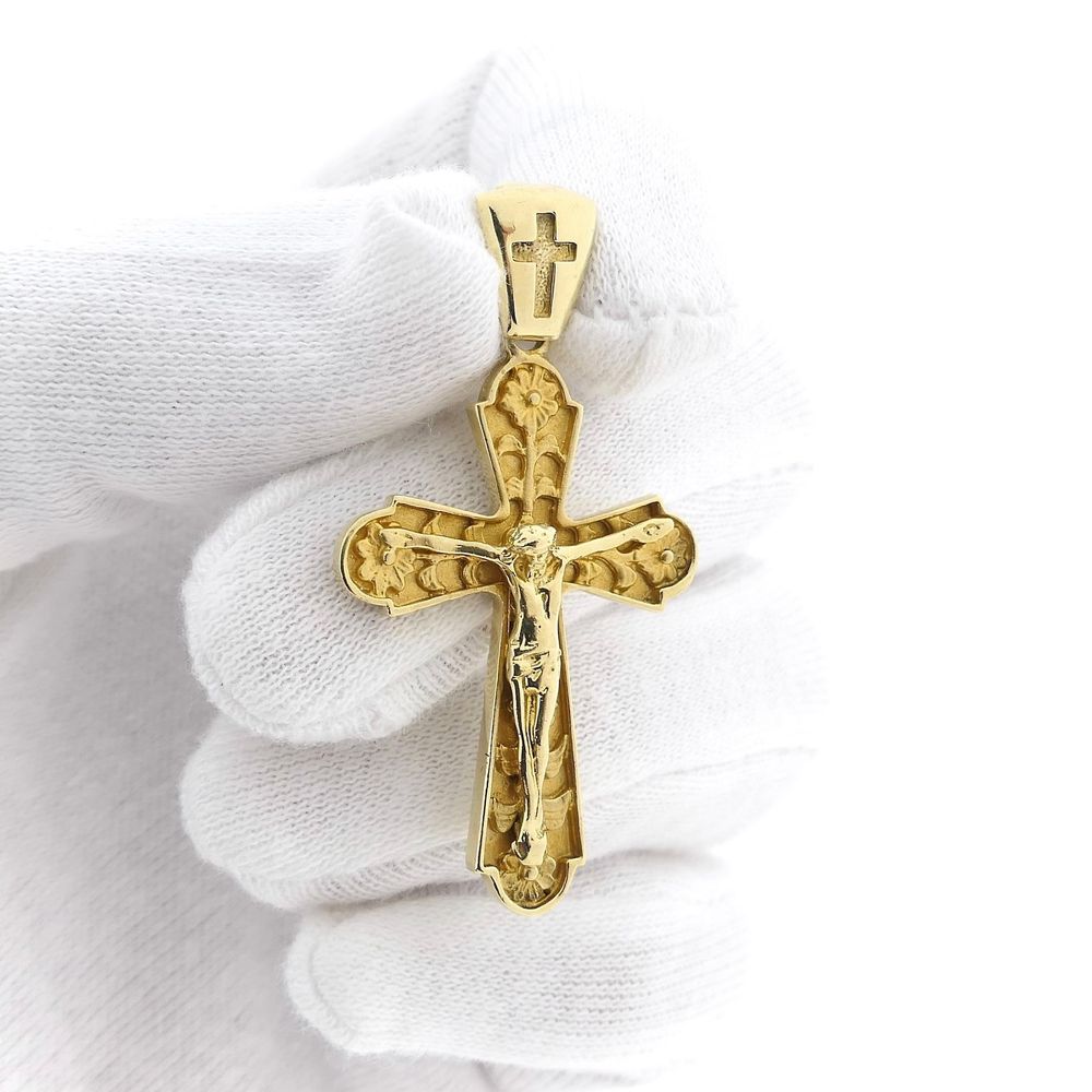 Gold pendant depicting the cross of Christ with its corpus. Behind the corpus, the cross is matted and engraved with flowers. The piece is beautifully detailed, as is the reverse. The pendant is crafted from 14-karat yellow gold (585/1000).