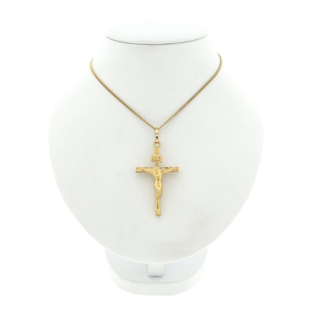 Gold pendant depicting the cross of Christ with its corpus. A small sign with "INRI" is carved at the top of the cross, which means "Iesus Nazarenus, Rex Iudaeorum"—Jesus of Nazareth, King of the Jews, in Latin. The cross is crafted with exquisite detail. The pendant is made of 14-karat yellow gold (585/1000).