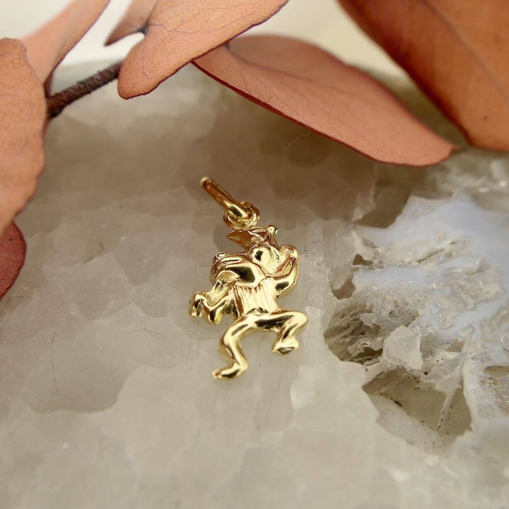 Gold pendant of a frog with an umbrella. The frog is wearing a striped T-shirt. A fun unisex pendant suitable for all ages. The pendant is made of 18-karat yellow gold (750/1000).