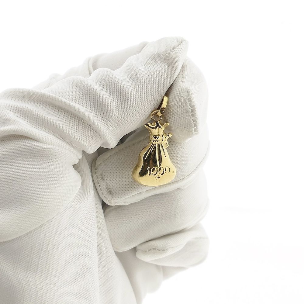 Gold money bag pendant. The money bag is engraved with $1000 and made of 14-karat yellow gold (585/1000).