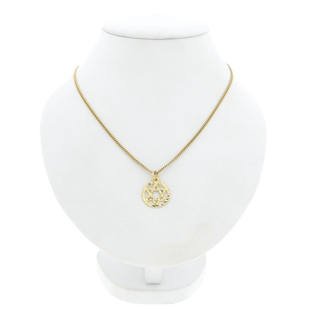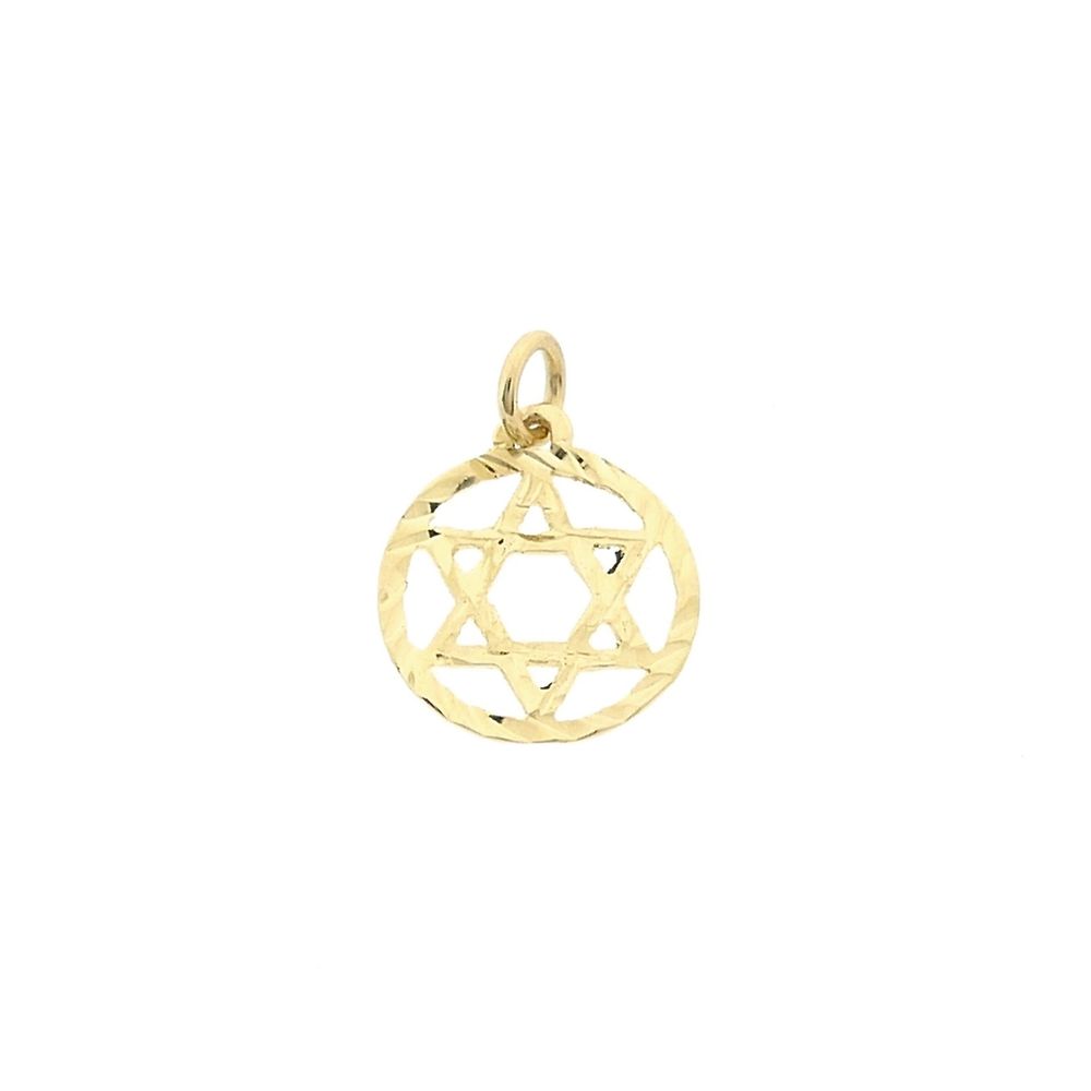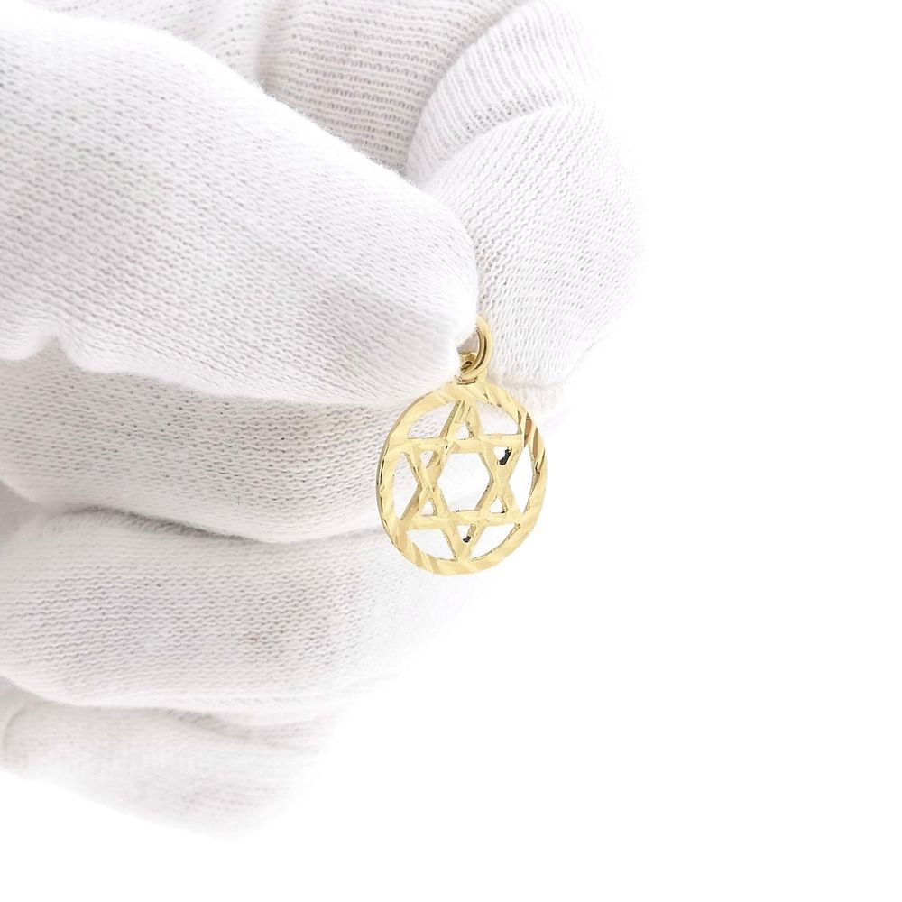 Gold Star of David pendant. The star is a family symbol of King David (1040-970 BC). A Star of David is also called Solomon's seal or hexagram. The Star of David is set in a round, ribbed frame and is made of 14-karat yellow gold (585/1000).