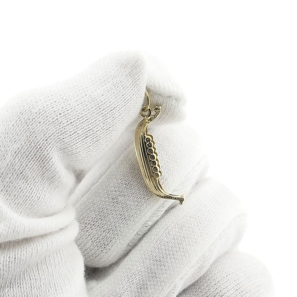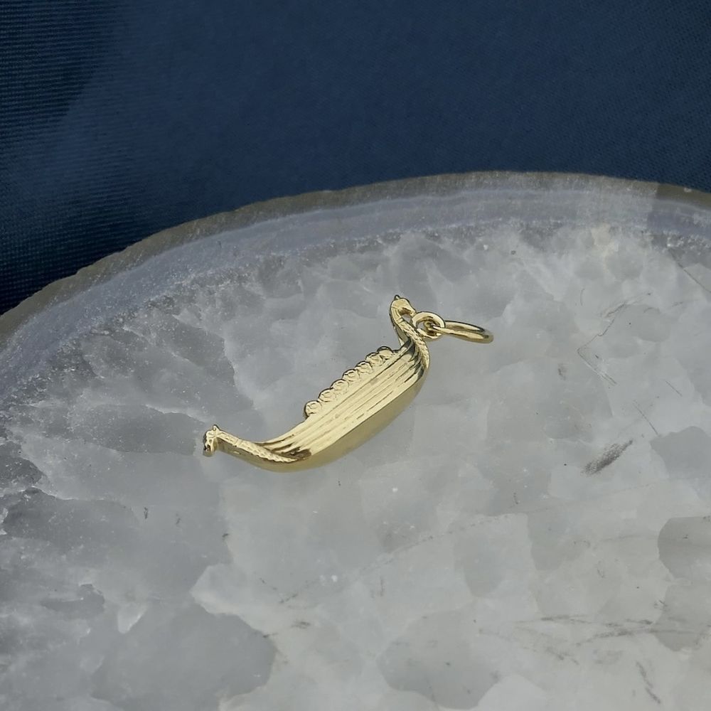 Gold pendant depicting a detailed Viking boat, with shields on both sides. Animal heads are visible at the ends. The pendant is crafted from 14-karat yellow gold (585/1000).