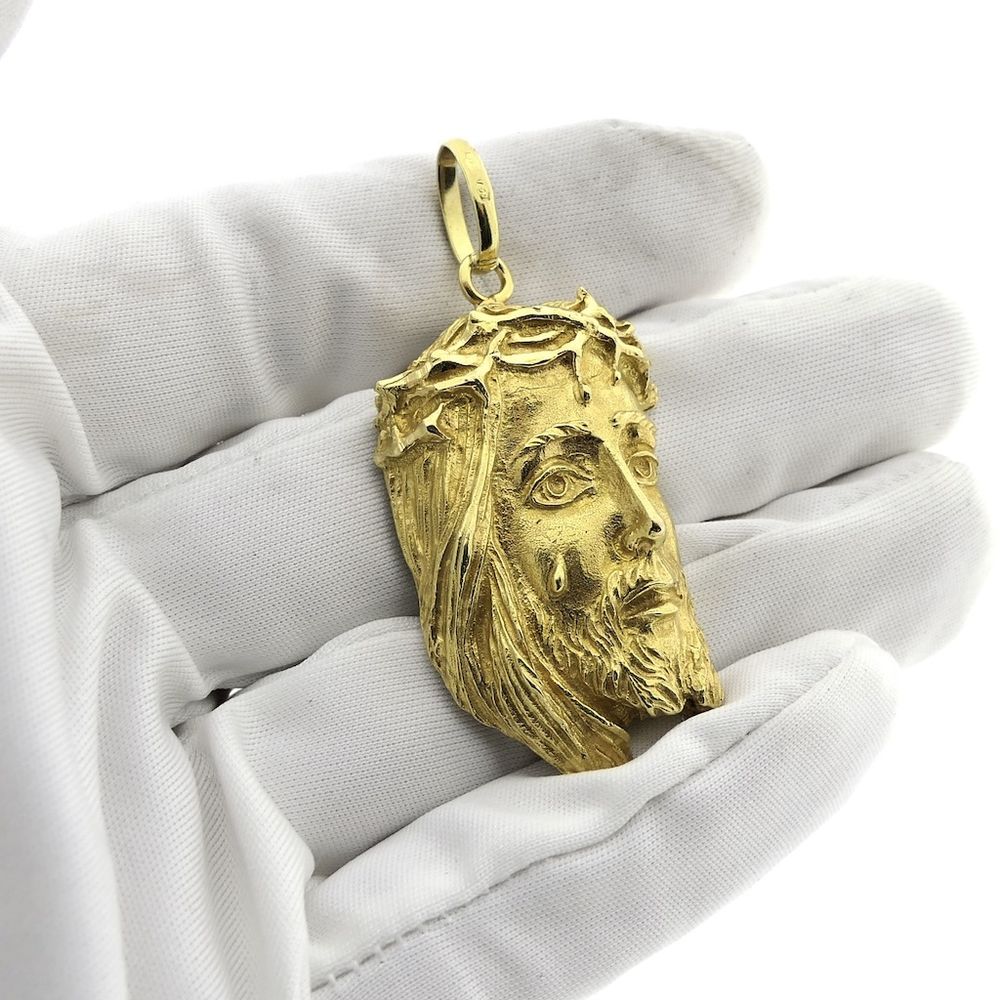 Gold pendant of the face of Jesus. Christ wears a crown of thorns and has a teardrop on his cheek. It is a solid pendant made of 18-karat yellow gold (750/1000).