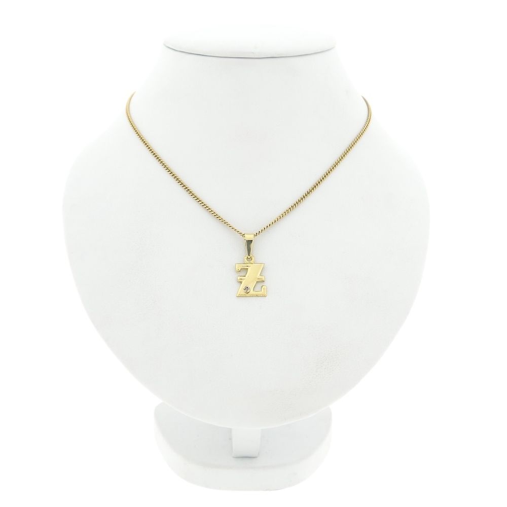 Gold pendant of the letter Z set with a round brilliant-cut diamond weighing 0.005 ct. The diamond is subtly incorporated into the letter. The pendant is crafted from 14-karat yellow gold (585/1000).