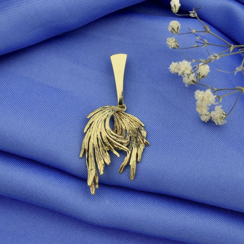 Gold wing pendant. The pendant has a graceful appearance and the wings have a rough finish. The wings are beautifully detailed, and the pendant is suitable for a small, narrow link chain. The piece is crafted from 14-karat yellow gold (585/1000).