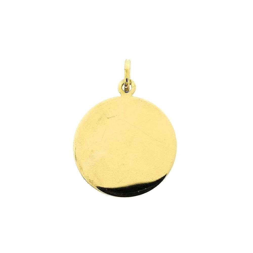 Gold pendant with a round engraved plate. A beautiful and subtle piece of jewelry crafted from 14-karat yellow gold (585/1000). Would you like a name engraved on the plate? We can! Contact us and inquire about the options and costs via WhatsApp or phone.