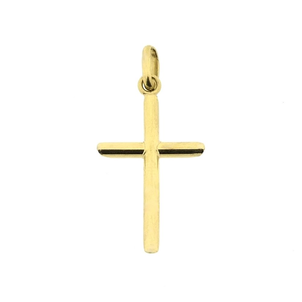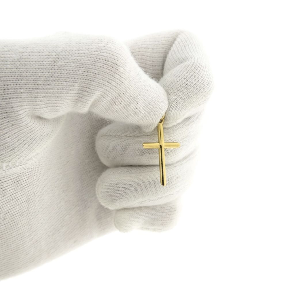 Gold pendant with a subtle cross. The ends are beveled at the back. The pendant is made of 14-karat yellow gold (585/1000).