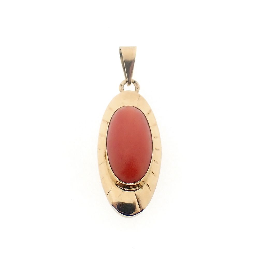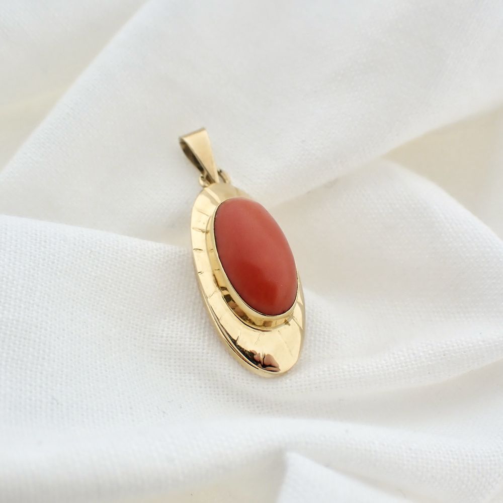 Gold pendant set with a precious coral. The precious coral is oval, as is the frame. The frame is engraved, adding depth to the piece. The pendant is crafted from 14-karat yellow gold (585/1000).