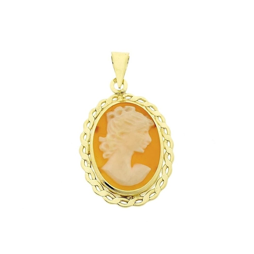 Gold pendant with cameo. Cameos were very popular in the last century and remain a beautiful piece of jewelry today. The stone is set in an antique-look frame. The pendant is crafted from 14-karat yellow gold (585/1000).