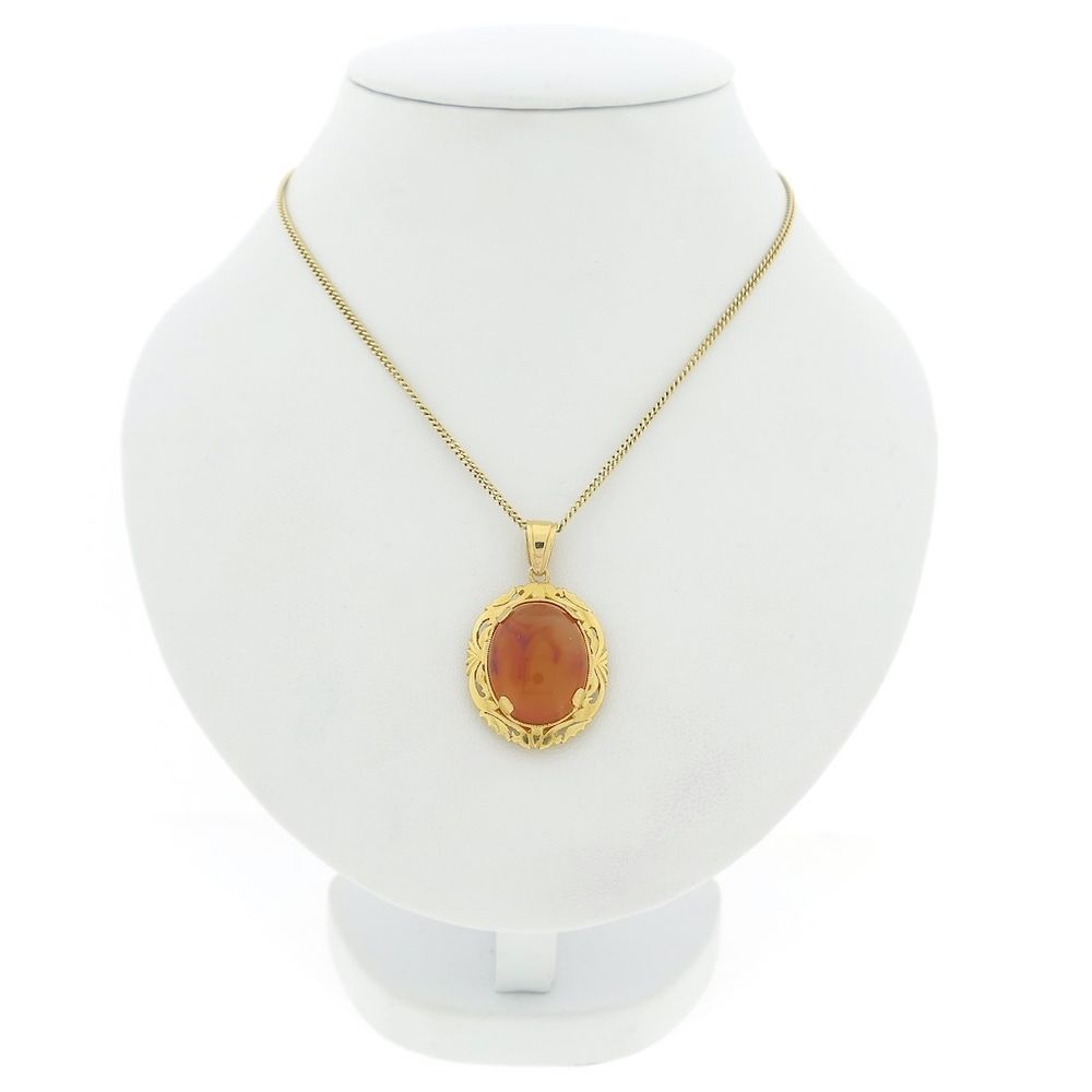 Gold pendant set with a carnelian. The elegant frame gives the pendant a vintage look. A beautiful stone with many layers, it displays different colors in the light. The pendant is crafted from 18-karat yellow gold (750/1000).