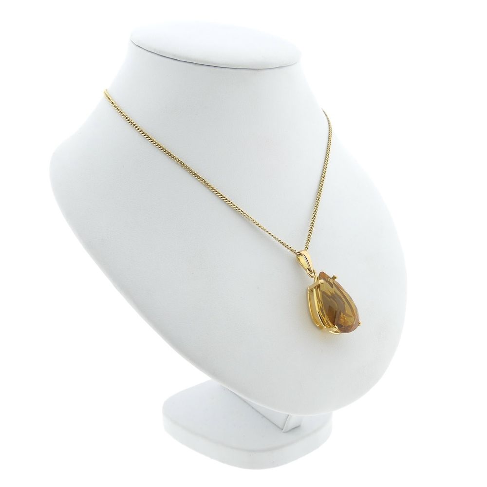 Gold pendant set with a large, pendeloque-cut citrine stone in a deep orange hue. Citrine is often found in a lemon yellow color, but it can also be found in other shades. The pendant is crafted from 18-karat yellow gold (750/1000).