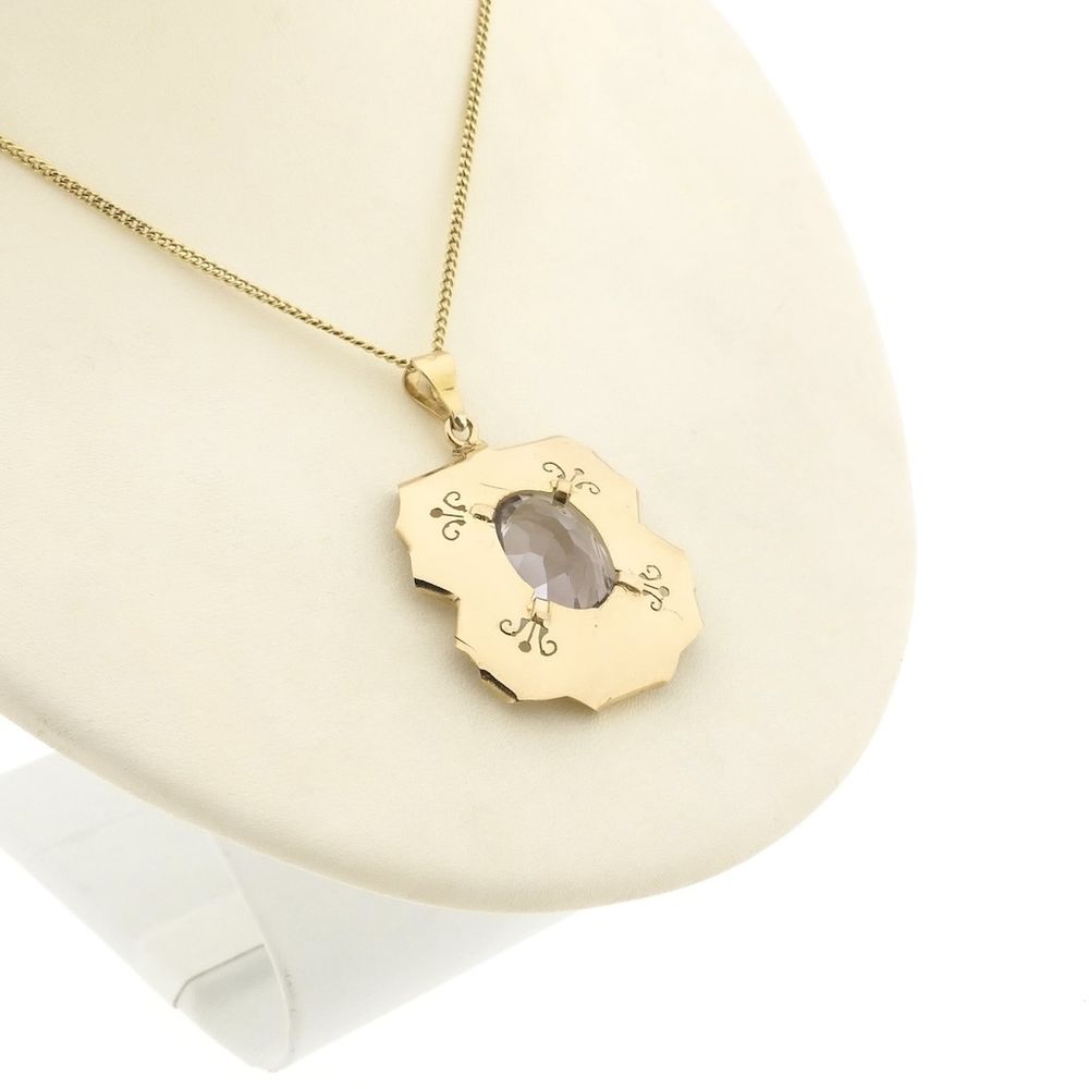 Gold pendant set with an oval facet-cut zirconia stone. The stone is translucent and has a blue-purple shimmer. The pendant is beautifully detailed with elegant accents. A striking and beautiful piece of jewelry. The pendant is crafted from 18-karat yellow gold (750/1000).