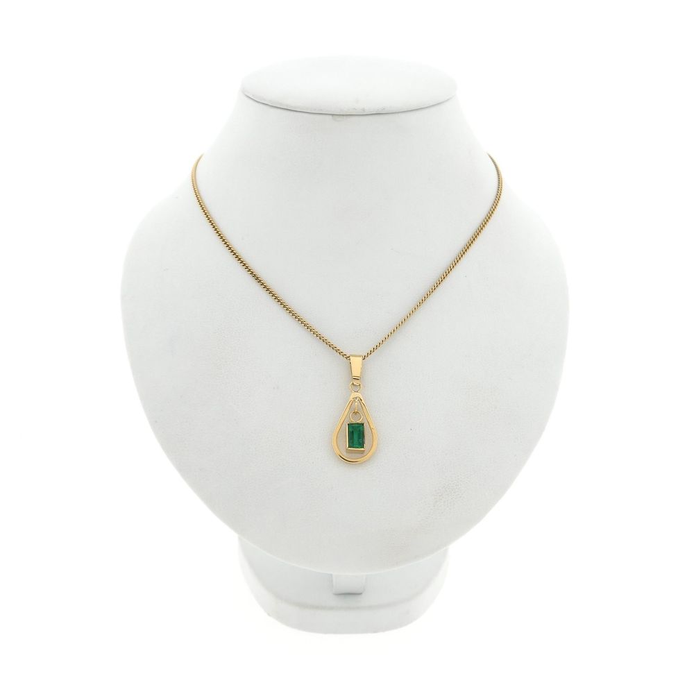 Gold pendant set with an emerald. The stone is baguette-cut and hangs loosely in the center of the pendant. The pendant is made of 14-karat yellow gold (585/1000).