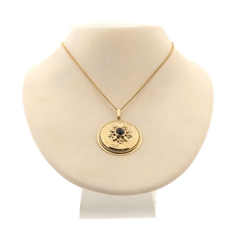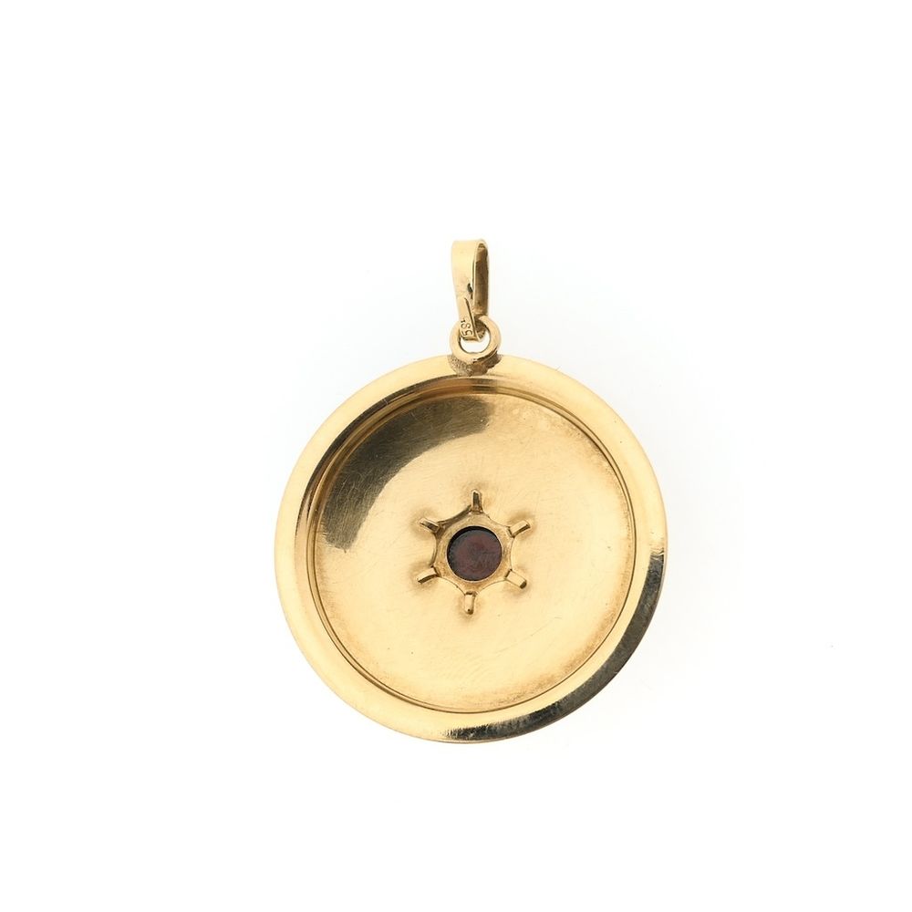 Gold pendant set with a garnet stone. The garnet has a diameter of 5.8 mm and is a beautiful dark red and slightly translucent. The setting is beautifully engraved. The pendant is crafted from 14-karat yellow gold (585/1000).