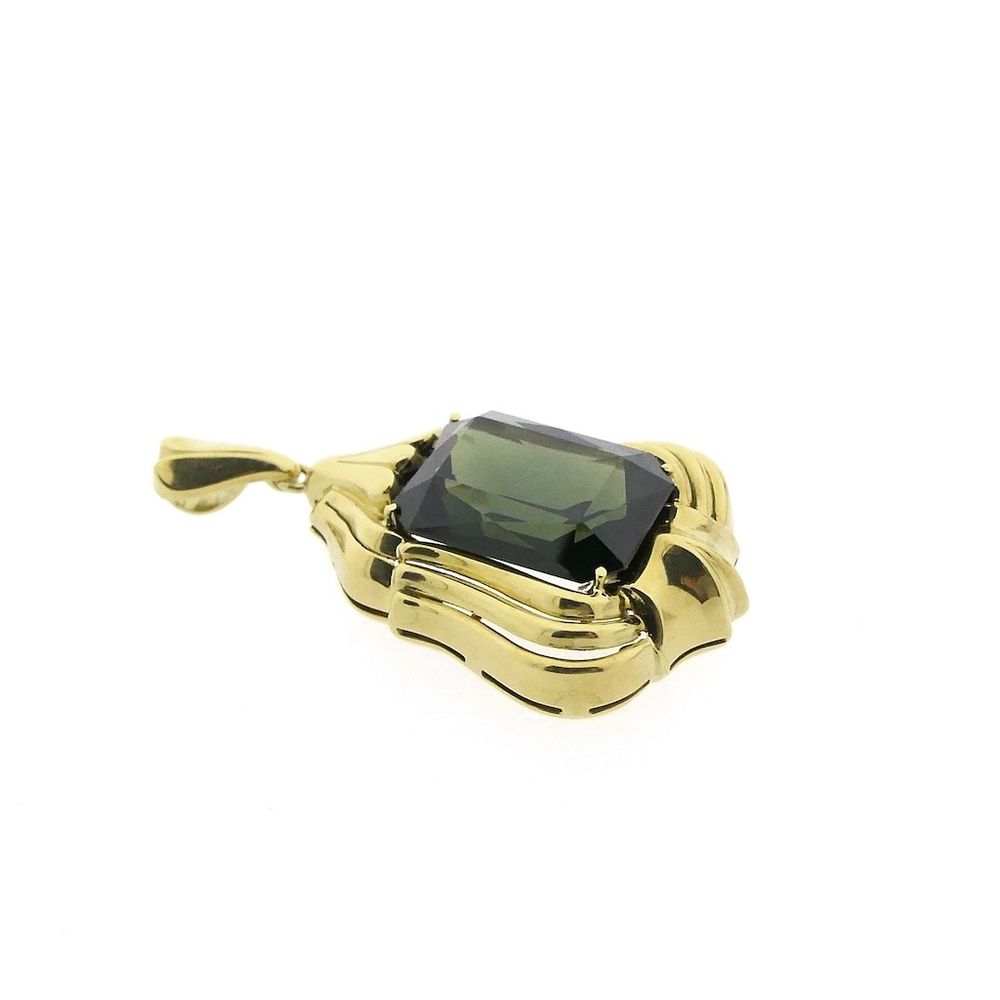Gold pendant set with tourmaline. The gemstone has a beautiful dark green color and is cut like a scissor cut. The setting is designed with layers and has an antique look. A beautiful piece of jewelry and a real eye-catcher. The pendant is crafted from 14-karat yellow gold (585/1000).