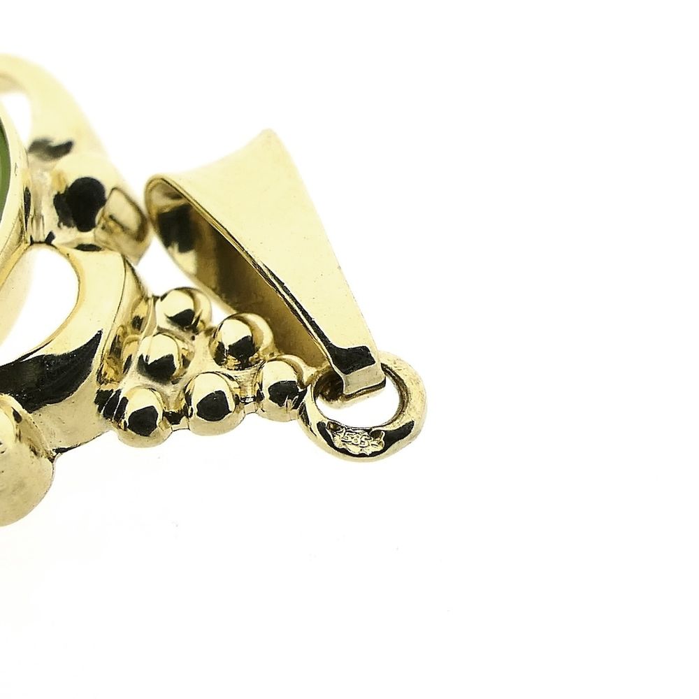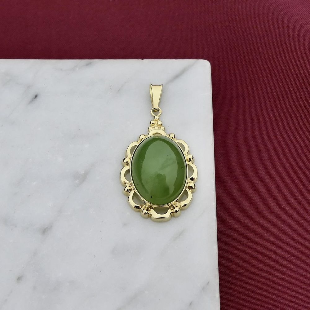 Gold pendant set with jade. The stone is oval-cut, cabochon-cut, and the setting gives the pendant a vintage look. A beautiful and classic pendant crafted from 14-karat yellow gold (585/1000).