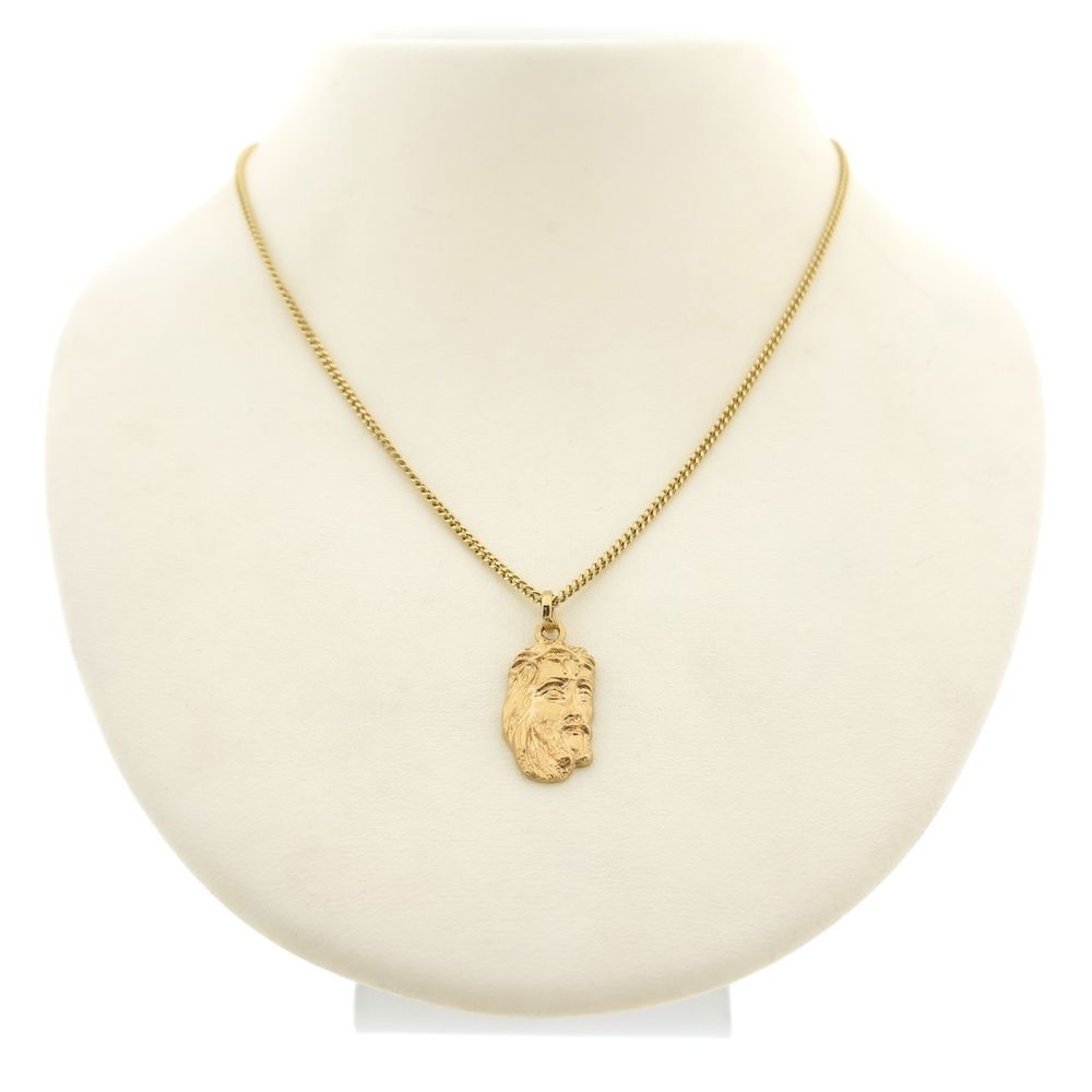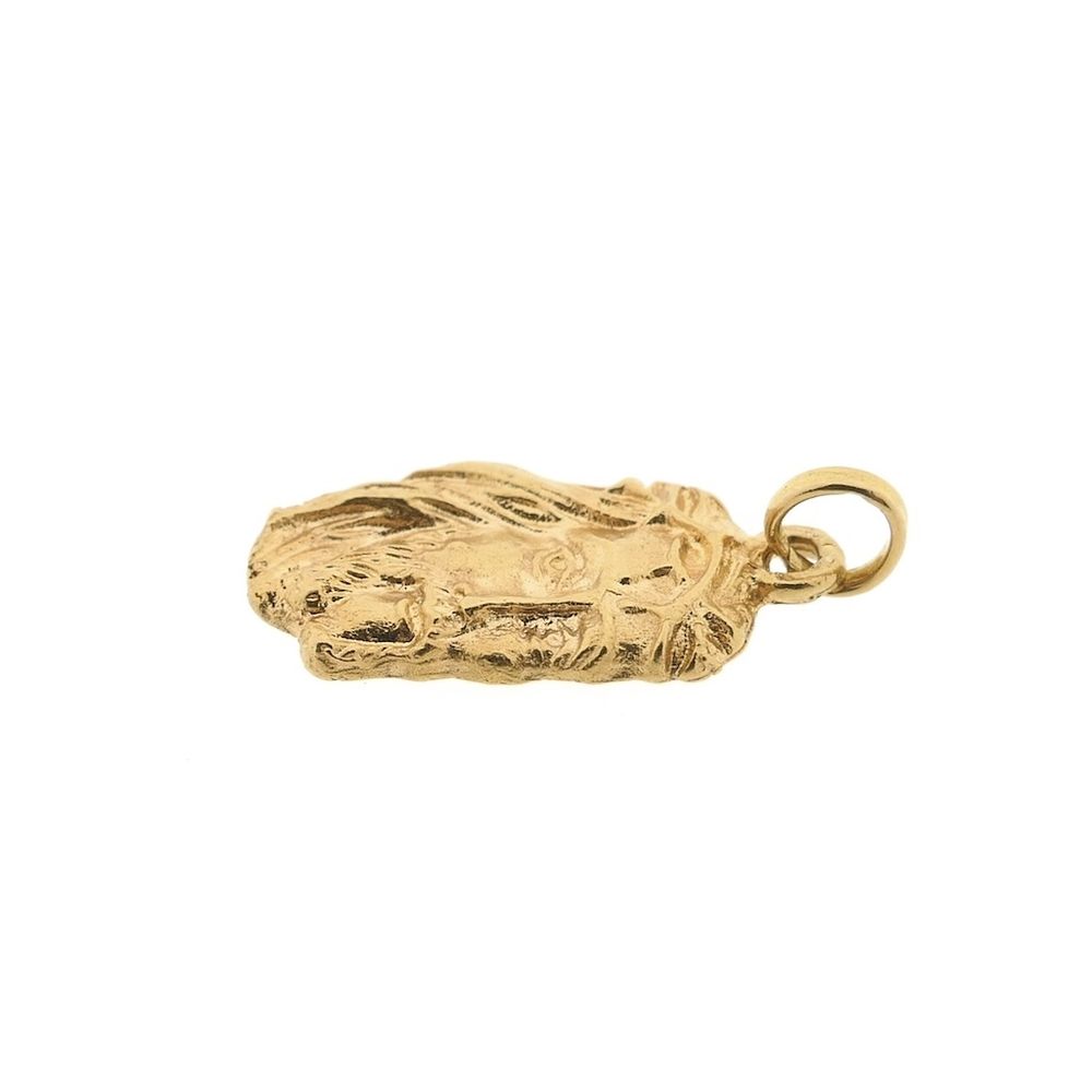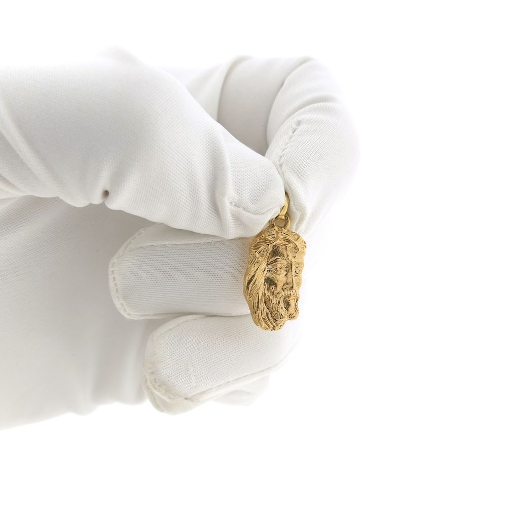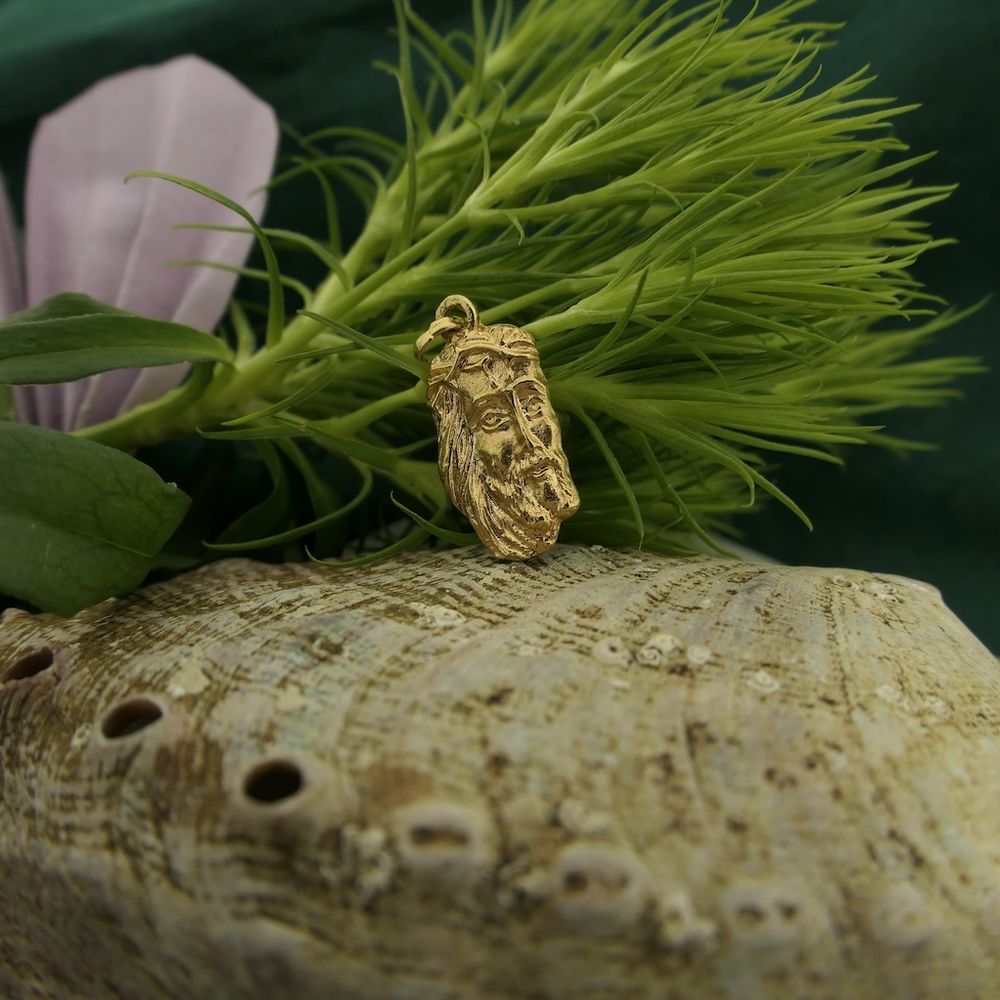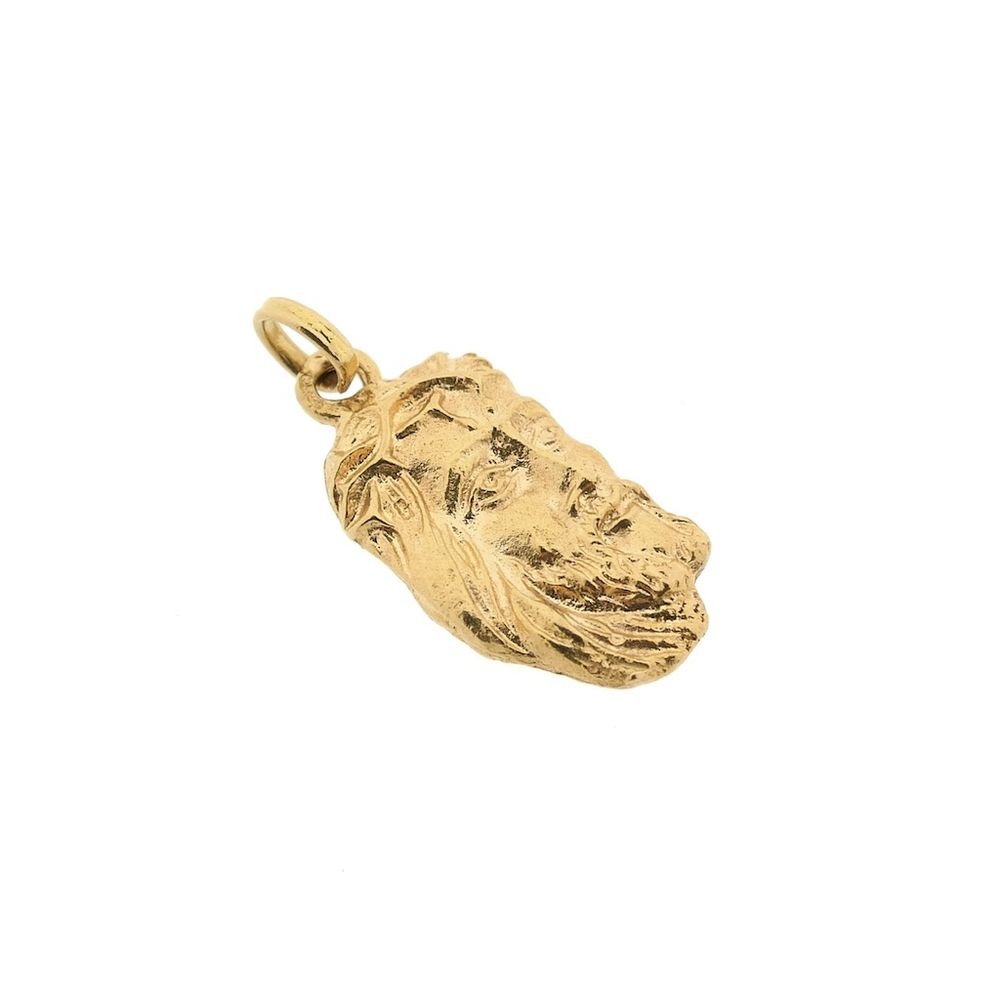 Gold pendant featuring the face of Jesus. A piece of jewelry with religious significance. The pendant is matted and detailed and crafted from 18-karat yellow gold (750/1000).