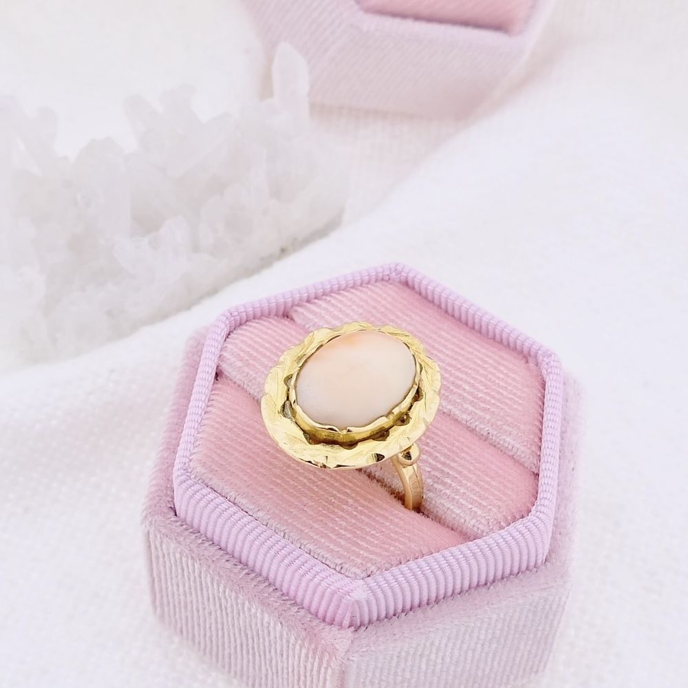 Gold ring set with angel skin coral