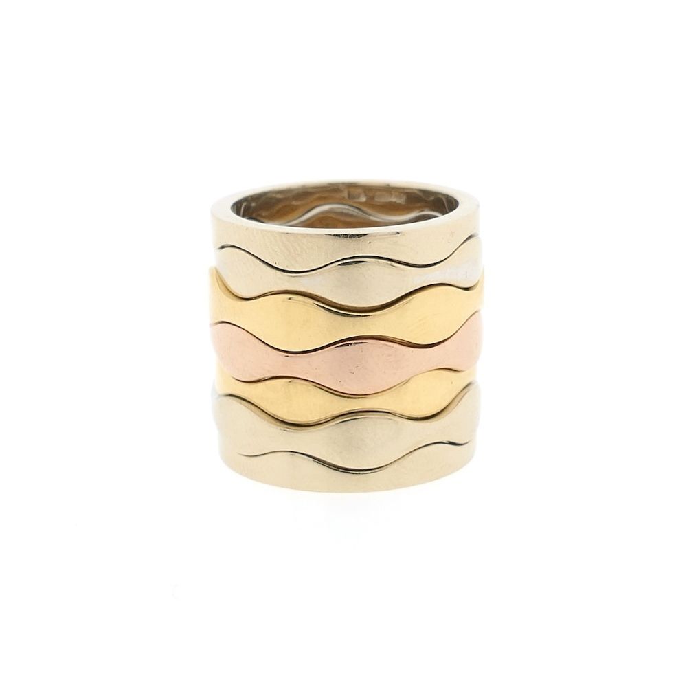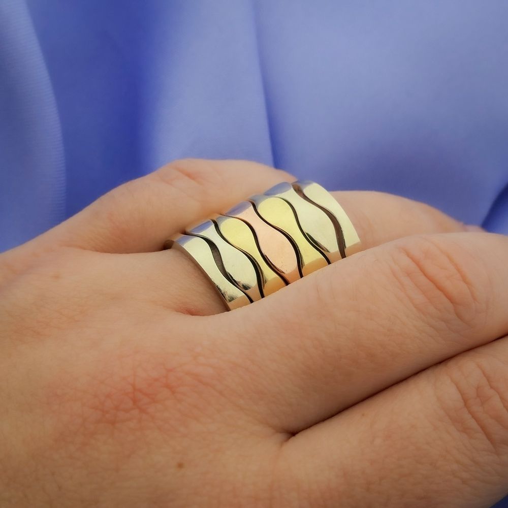 Tricolor gold ring set. The ring is made of seven wavy rings in different gold tones. The top and bottom are flat on one side. This exclusive ring weighs 26.73 grams and is crafted from 14-karat yellow, white, and rose gold (585/1000).
