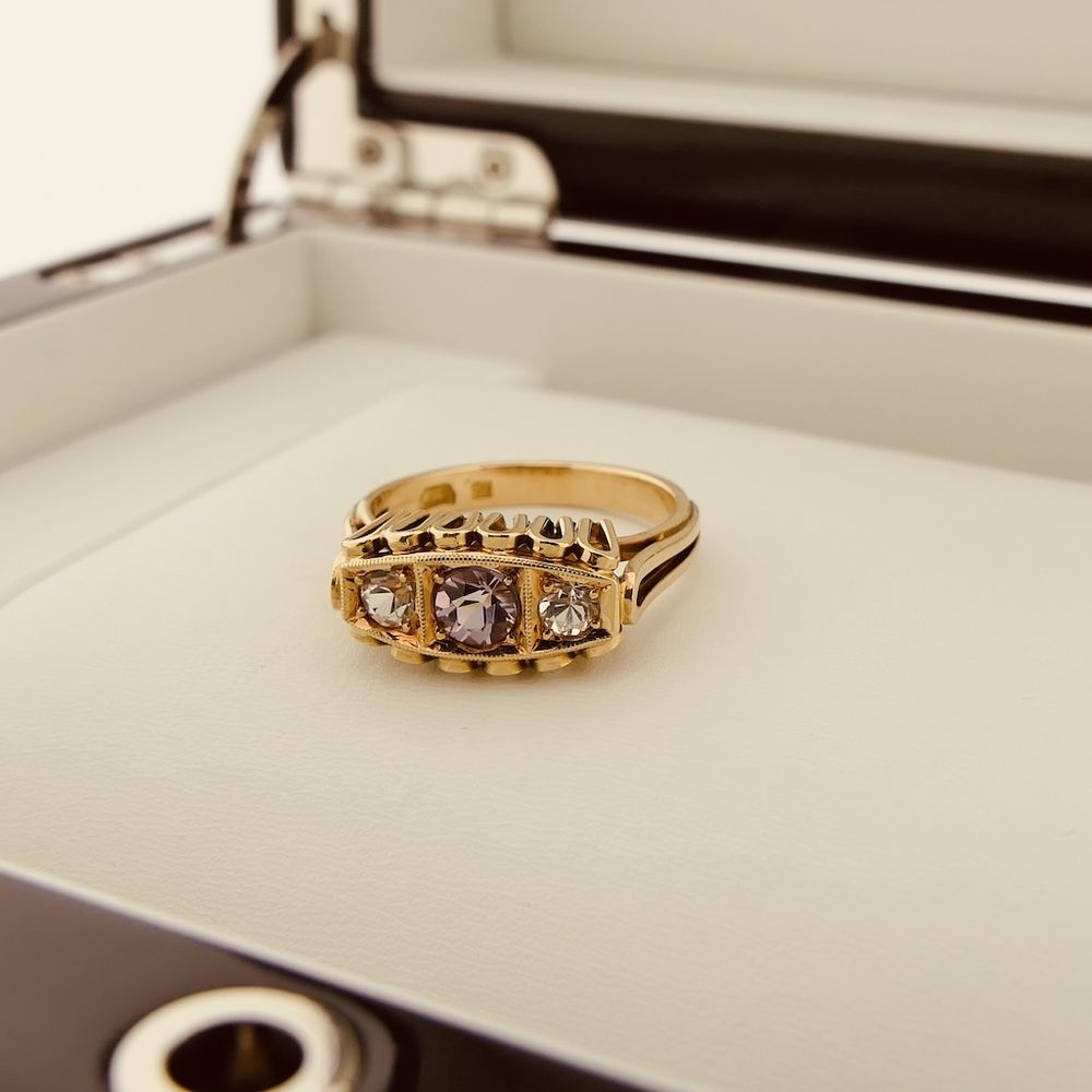 Gold ring set with round, brilliant-cut colored zirconia stones. The ring has a vintage look and is crafted from 14-karat yellow gold (585/1000).
