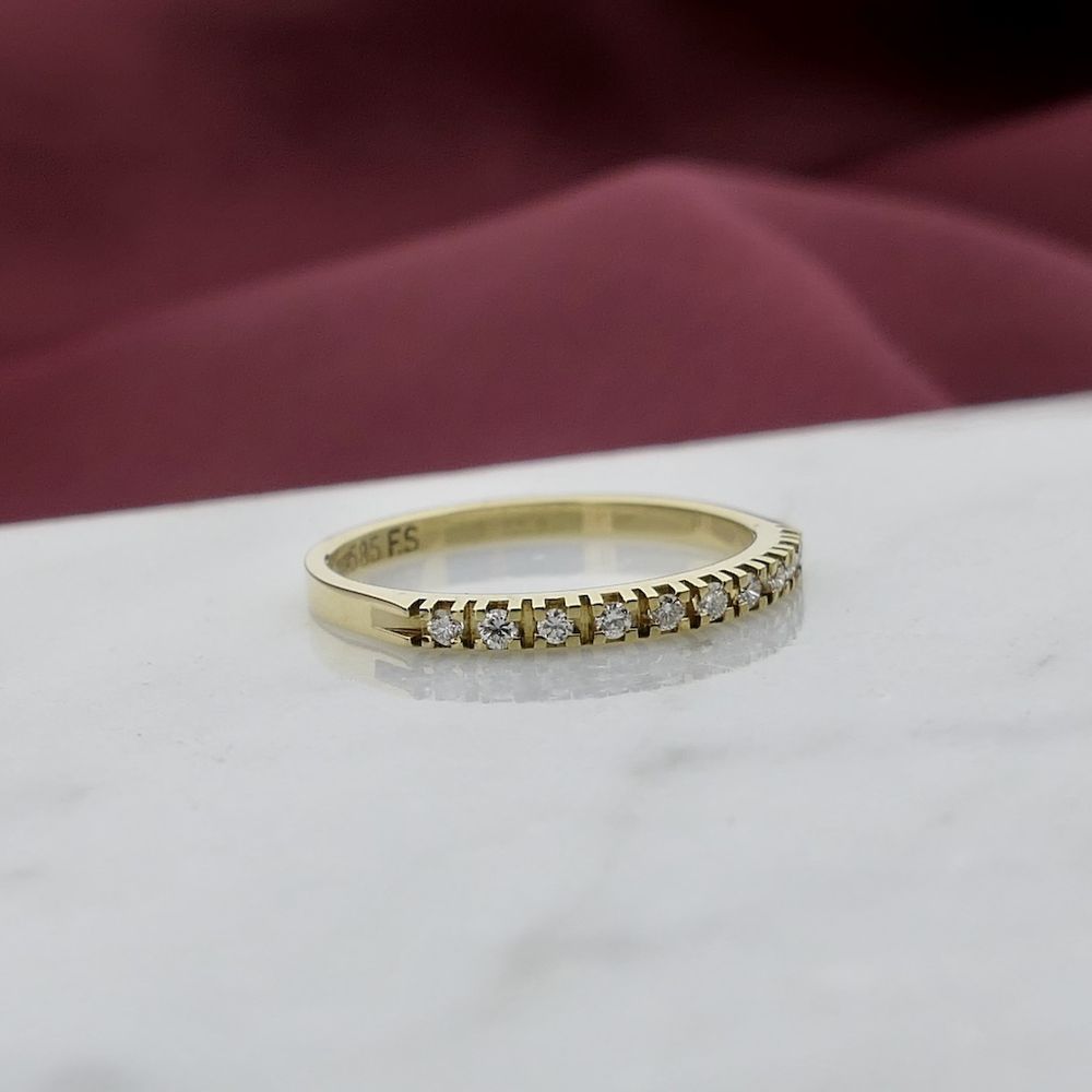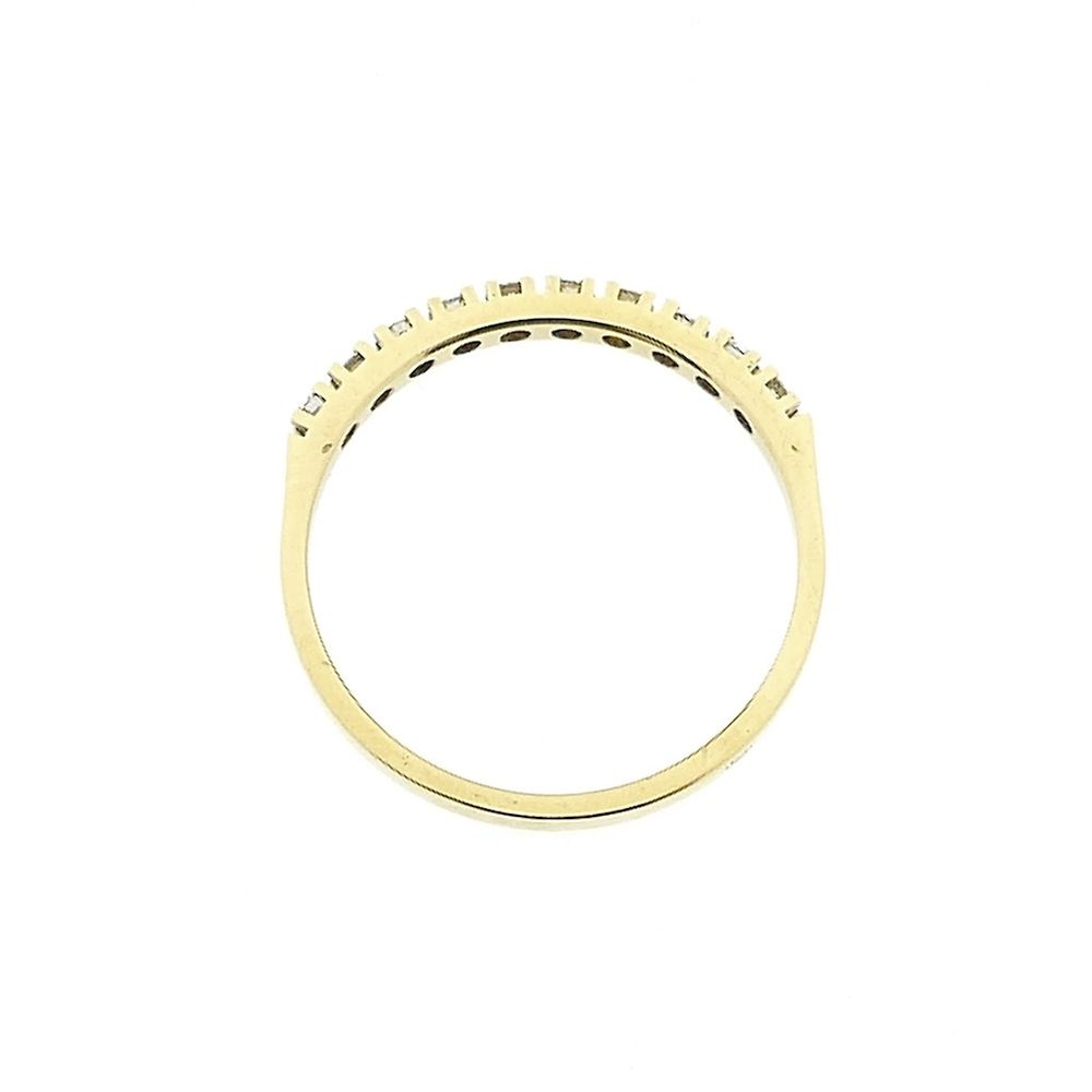 Gold ring set with 10 stunning diamonds with a total weight of 0.10 ct. A modern and elegant ring crafted from 14-karat yellow gold (585/1000). * This piece of jewelry is set with a natural diamond. Ring size: 16.25 Diamonds are perhaps the most famous and coveted gemstone in the world. Diamonds symbolize eternity due to their exceptional hardness; they are the hardest gemstones, scoring a 10 on the Mohs scale. Diamonds are graded based on various criteria, including color, clarity, weight, and cut quality. When a diamond is exceptionally well-cut, it displays a dazzling display of sparkle. The most sought-after color is D, sometimes referred to as "River." What many people don't know is that diamonds also come in other colors, including yellow, brown, blue, green, and even black. Natural diamonds are formed deep within the earth over millions of years, while lab-grown diamonds are created in a laboratory using advanced technology that mimics the natural process. Both types are virtually identical chemically and physically, but lab-grown diamonds are often more affordable and environmentally friendly.