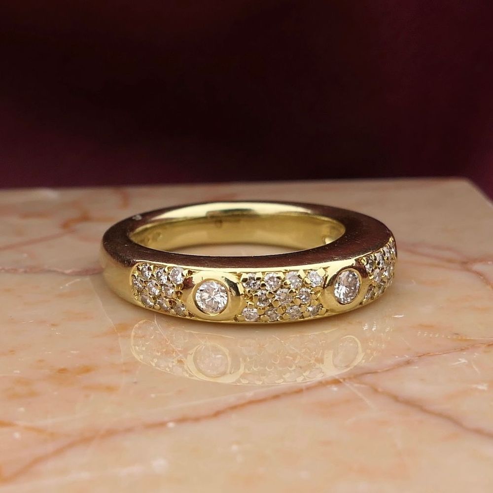 Gold ring set with brilliant-cut diamonds. The ring head is slightly domed. A unique and striking piece with a playful and luxurious look. The ring is crafted from 14-karat yellow gold (585/1000).