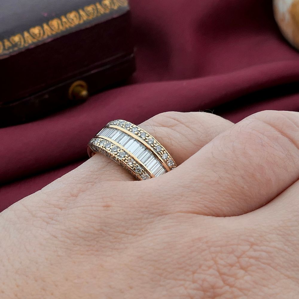 Luxurious gold ring set with a total of 1.20 ct. of diamonds. The diamonds are set in three rows, with a baguette-cut center row. This stunning ring is crafted from 14-karat yellow gold (585/1000).