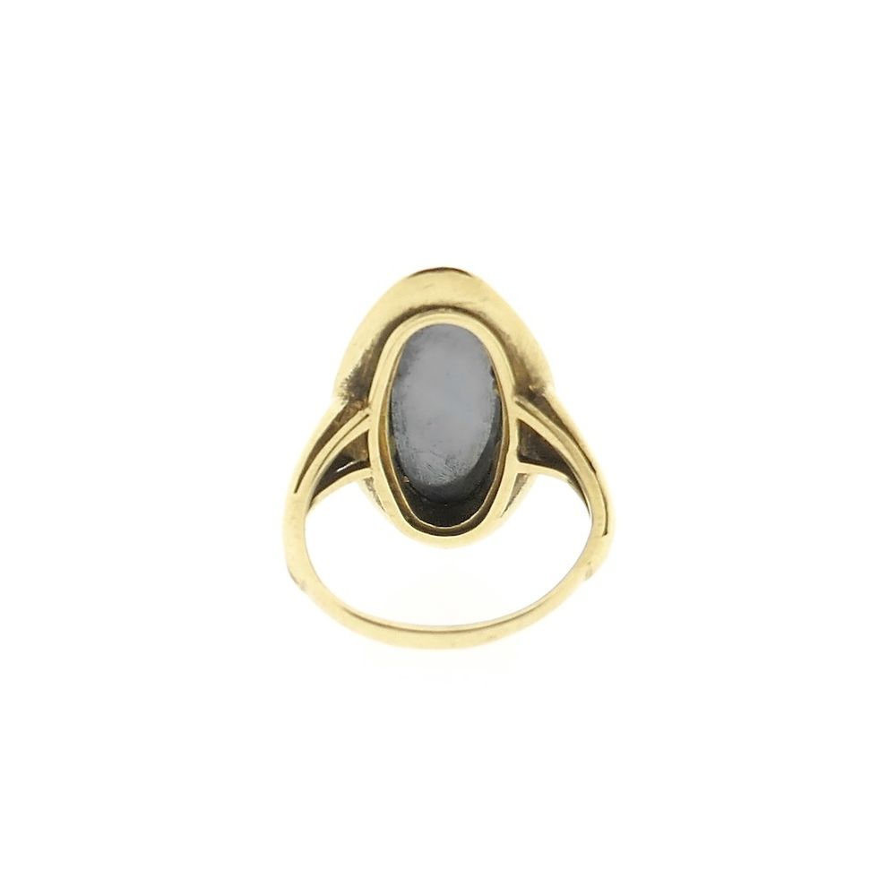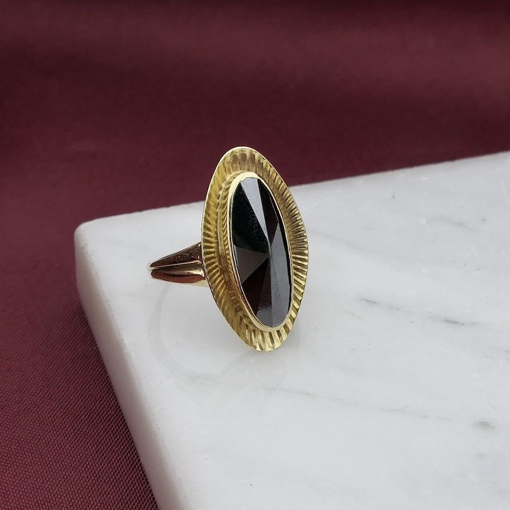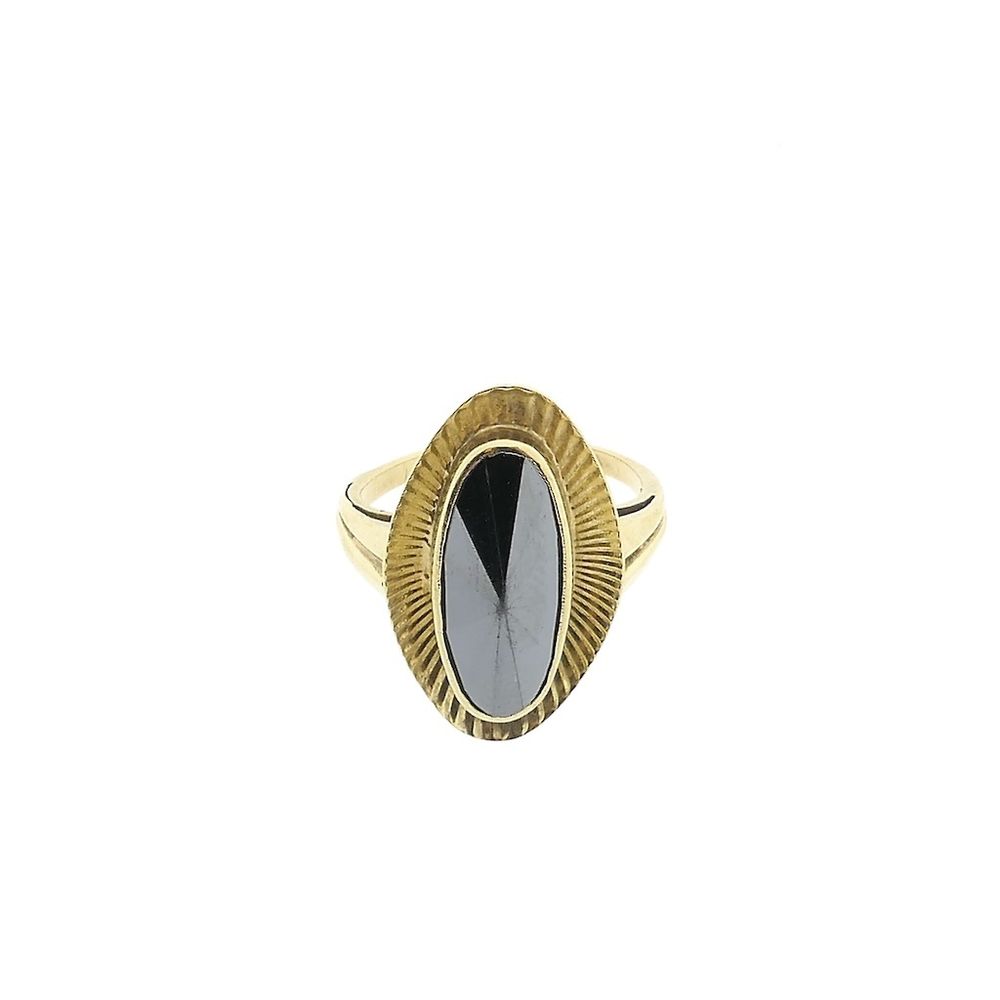 Gold ring set with an oval facet-cut hematite. The hematite has a dense metallic black color. The setting gives the piece a vintage and dynamic look. This beautiful women's ring is crafted from 14-karat yellow gold (585/1000).