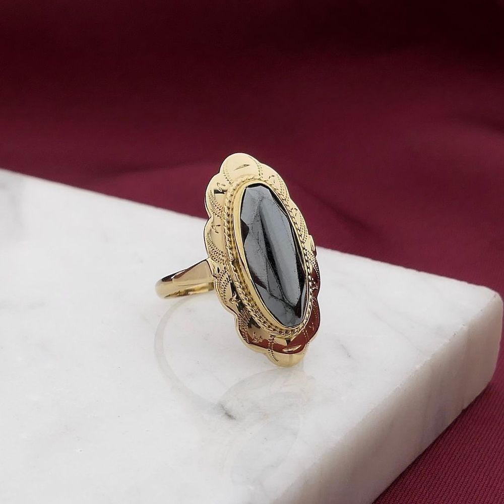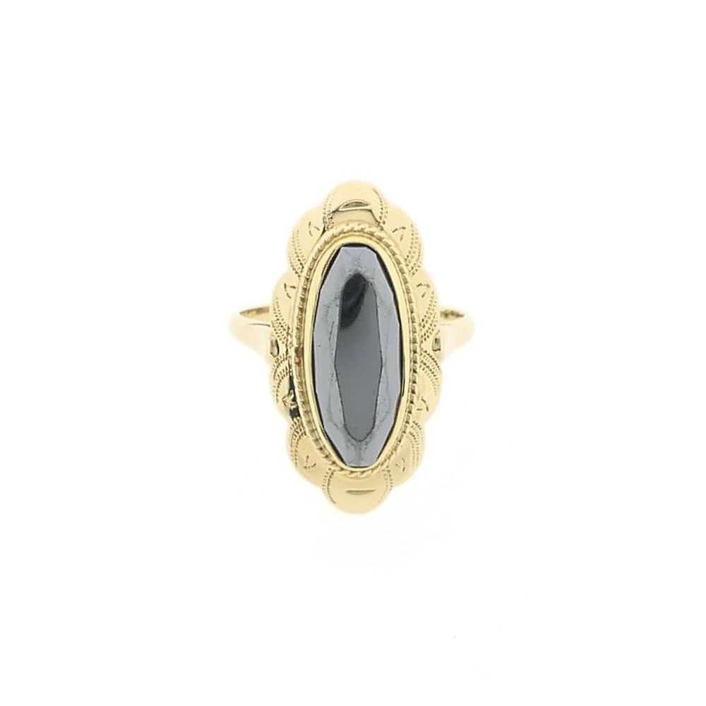 Gold ring set with an oval faceted hematite. The hematite has a dense metallic-black color. The setting gives the jewelry a vintage and subtle appearance. It is a beautiful ladies' ring made of 14-karat yellow gold (585/1000).