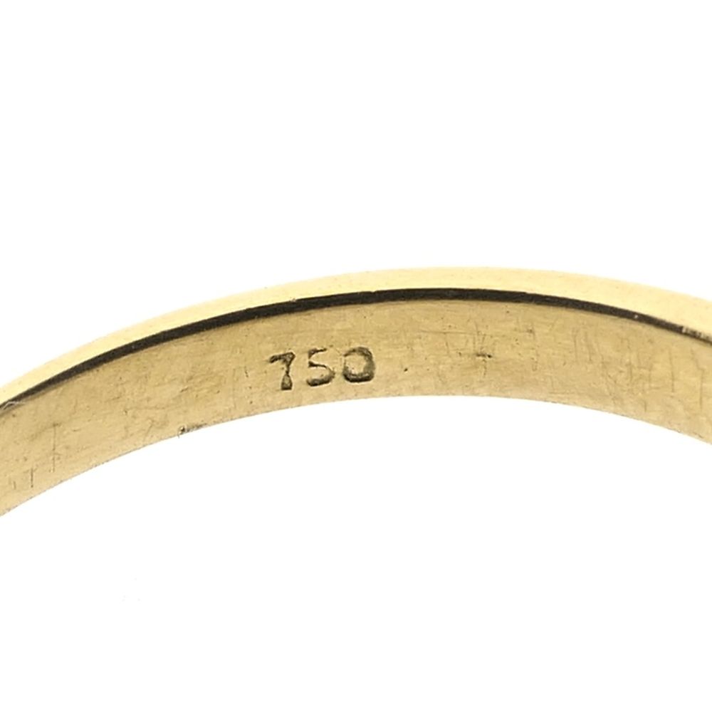 Gold ring set with an oval facet-cut sapphire. The stone is set between four prongs in a V-shape. This beautiful ring has an elegant appearance and is crafted from 18-karat yellow gold (750/1000).
