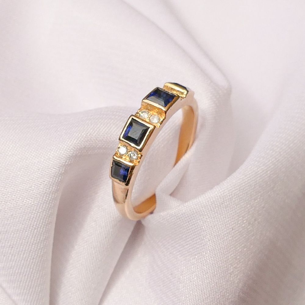Gold ring with a sapphire and a total of 0.03 ct. of diamonds. The ring is set with alternating sapphires and two small diamonds. The sapphire is square-cut, the diamonds brilliant-cut. A stunning combination of gemstones in a beautiful ring. The ring is crafted from 18-karat yellow gold (750/1000).
