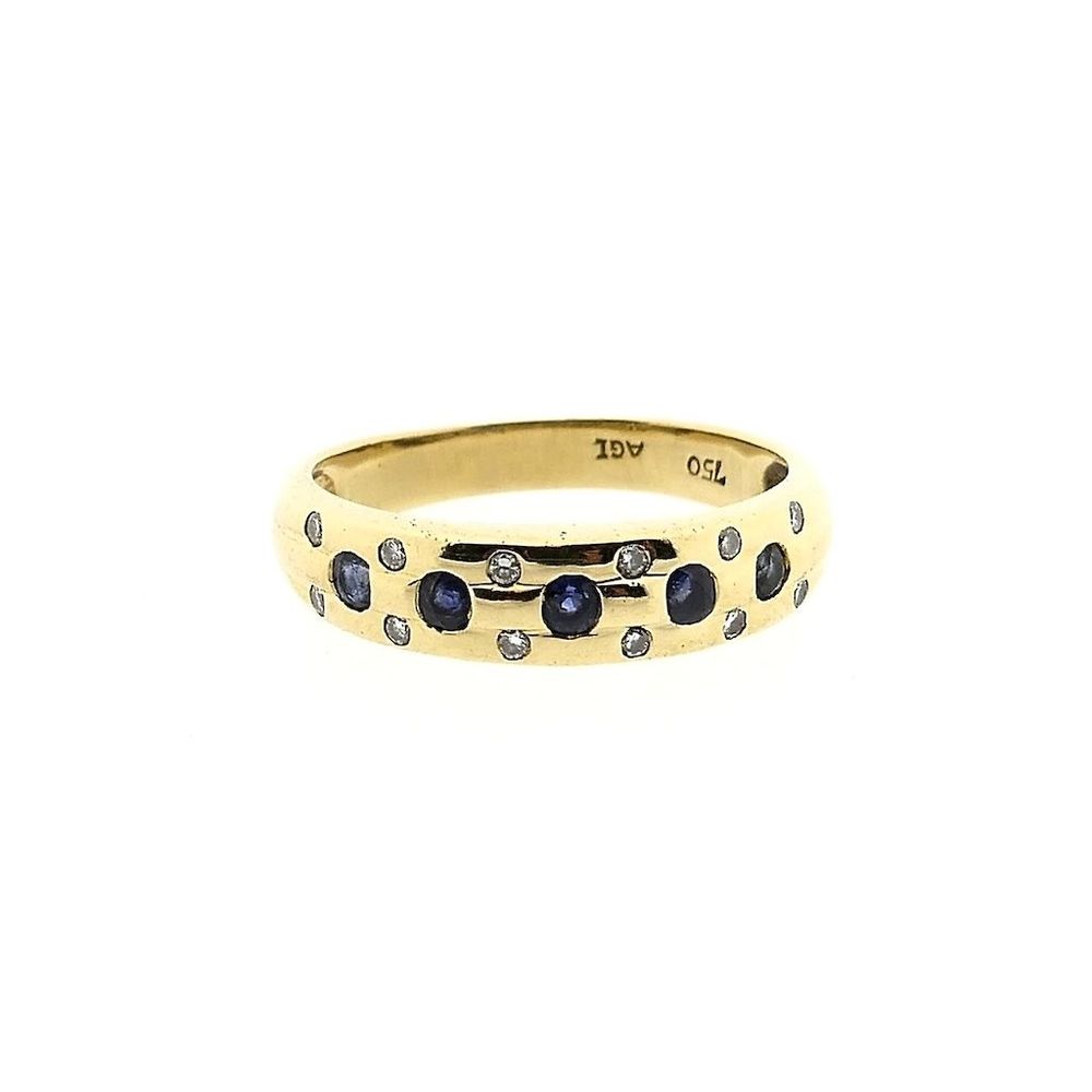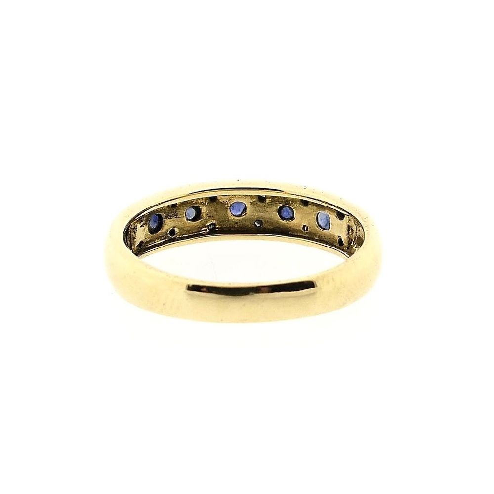 Gold ring set with stunning round brilliant cut diamonds and sapphires. The diamonds have a total weight of 0.12 ct. A beautiful combination of gemstones in a magnificent ring. This luxurious ladies' ring is made from 18 carat yellow gold (750/1000).